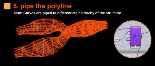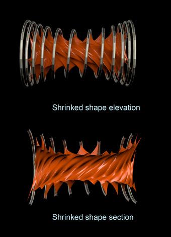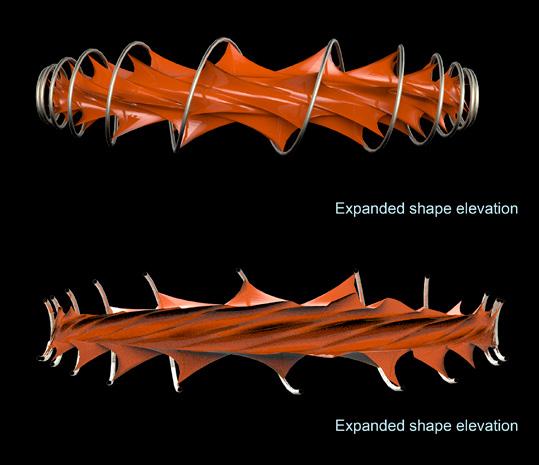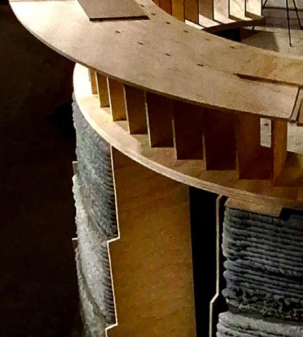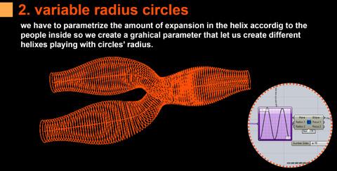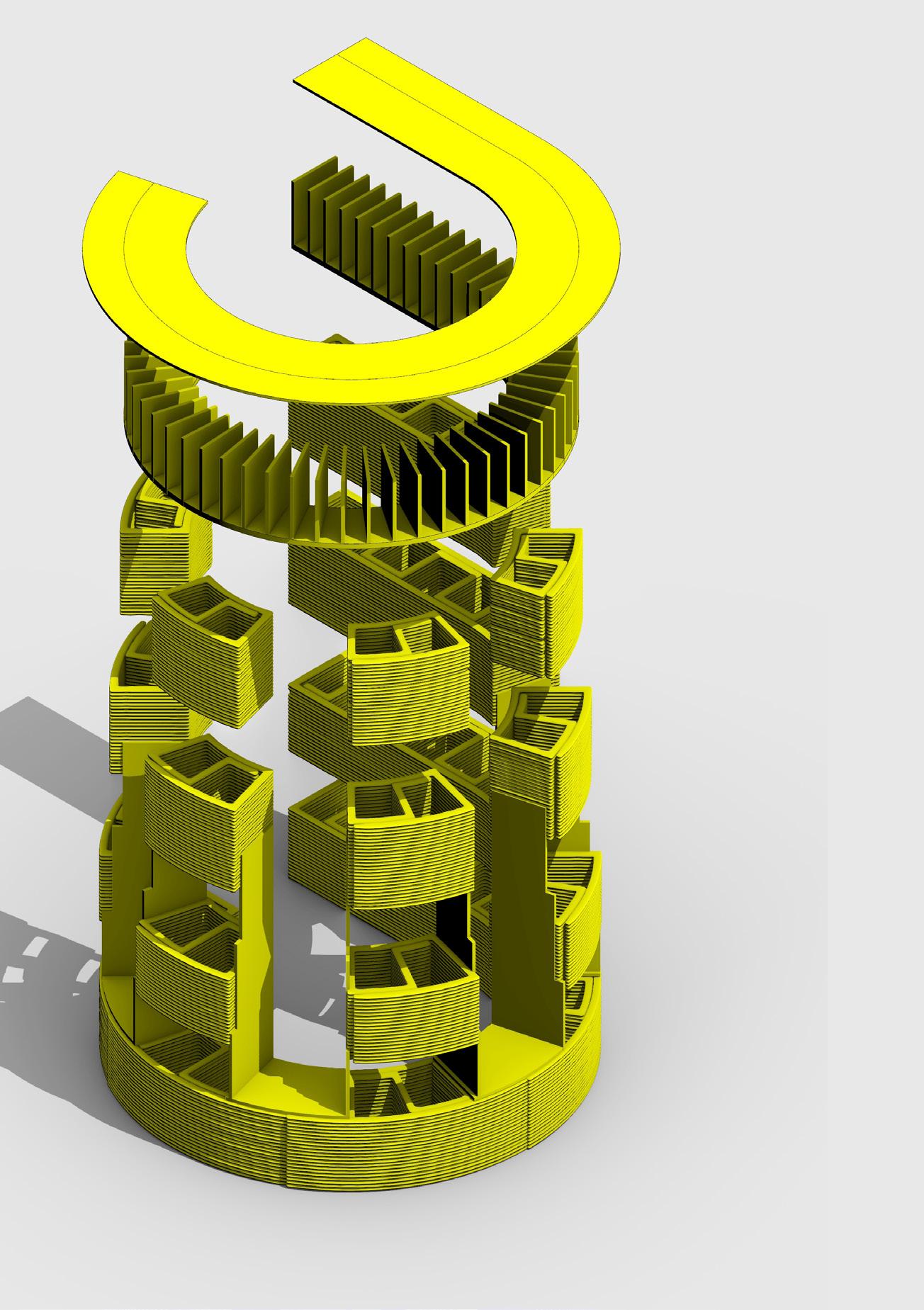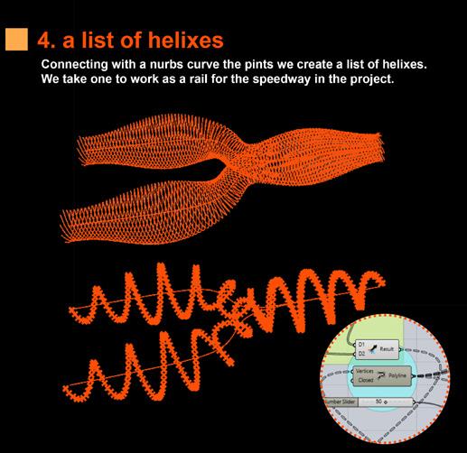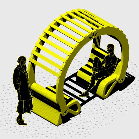 The vehicle is composed of a metallic exos- keleton managed by an interior metallic beam that also functions as a usable floor. The interior is covered by a plastic fiber that can contract and stretch using fixing elements on the perimeter of the structure. The pathways share the morphological ori- gin of the vehicles but develop a particular investigation in which it allows the spirals to bifurcate in order to change tracks or share routes