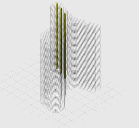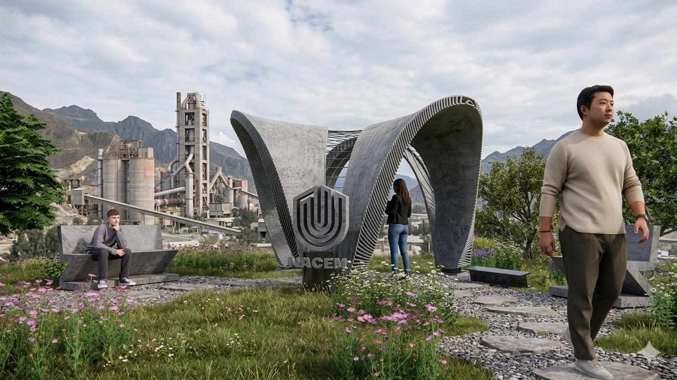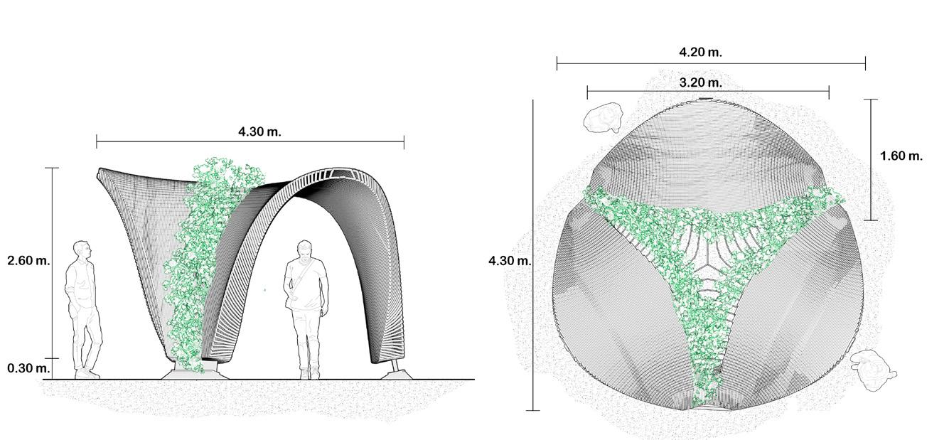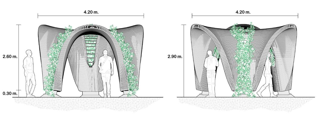 Unacem Pavilion. The commission involves the design of a visitor booth at UNACEM’s cement extraction qua- rry in Peru. In response to the need to efficiently manage visitor flow, provide an observation point overloo- king the processing plant, and ensure sufficient shade for visitors, a single continuous architectural gesture was chosen. This design harnesses the unique possibilities of non-planar 3D printing combined with vegetation as a unifying element. The vegetation introduces a dynamic component that allows visitors to perceive the pas- sage of time and seasonal changes, creating on contrast with the solid, timeless character of concrete.