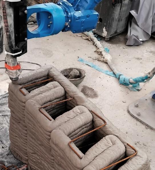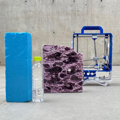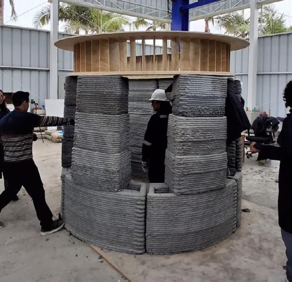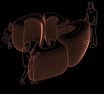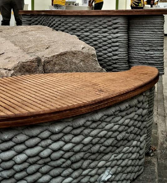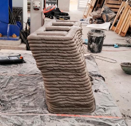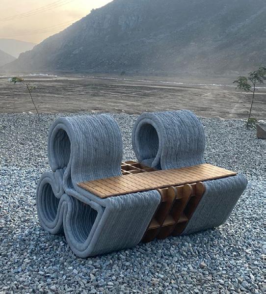 Amancay Benches. Our 3D prin- ting experiments caught the attention of major construction companies, such as UNACEM, the country’s lea- ding cement producer. They commis- sioned us to develop the first training program focused on custom G-code for cementitious additive manufacturing. Subsequently, we fabricated the furniture designed by the program’s participants. The result was three reinterpretations of the Amancaes flower, the most representative natu- ral icon of the Amancay Sanctuary, which now serve as rest areas and contemplation spaces for visitors.