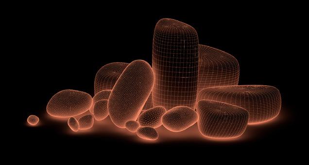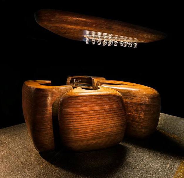 Canto Table. A key element is the accom- panying Canto Table, computationally de- signed to imitate river-worn pebbles (cantos rodados) via rationalized parametric geome- try and digital morphogenesis. Produced with the same hybrid pipeline, they blur lines between natural erosion, computatio- nal design, and human touch. Together, bar and tables form a quiet manifesto of cultu- ral continuity—reframing Peru’s carpentry and Pisco traditions through democratized tools—where digital precision frames and enhances, rather than replaces, the ex- pressive imperfections of the human hand, lending the objects authenticity, depth, and unique material presence.