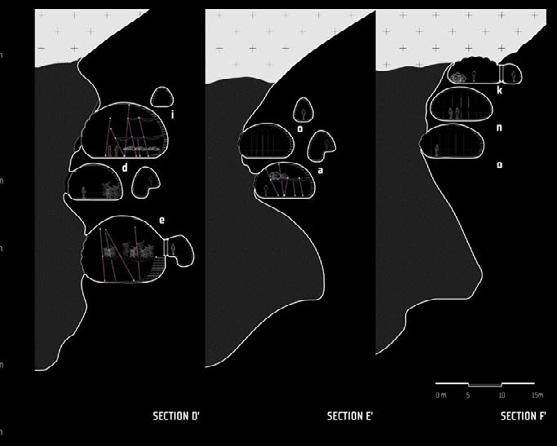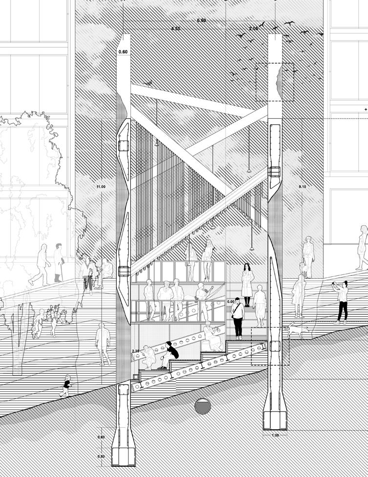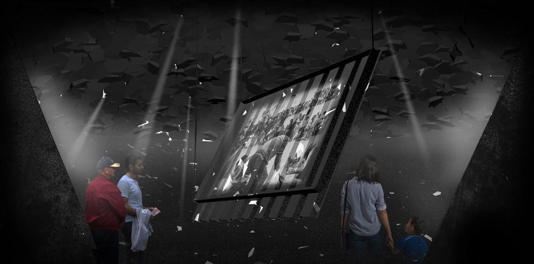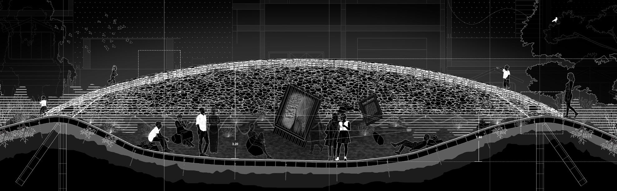Stone Slab Vaults. As a memorial devi - ce, the construction of semi-subterrznean vaults is proposed, covered with preexisting sections of the wall supported by an upper metal structure. Inside these vaults, projec - tions and museistic collections related to urban segregation, as well as the wall’s own history and sociocultural development in relation to its context, would take place.