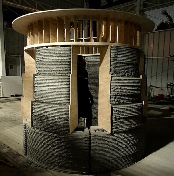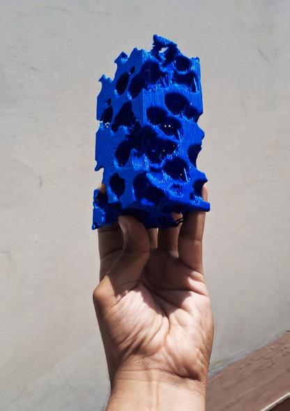The initial constraints of the Cartesian printers used limited the pro- duction area to 1 m³. To address this, a block-stacking strategy was developed to allow for the pavilion’s growth. Due to the instability of early material mixes, which hindered the printing of complex iterations, a repetitive and stable modu- le was designed. This module featured a 40 cm thickness to ensure structural integrity. This process resulted in the first 3D-printed habitable space made of mortar in Peru.
