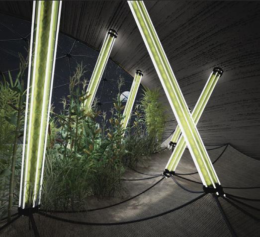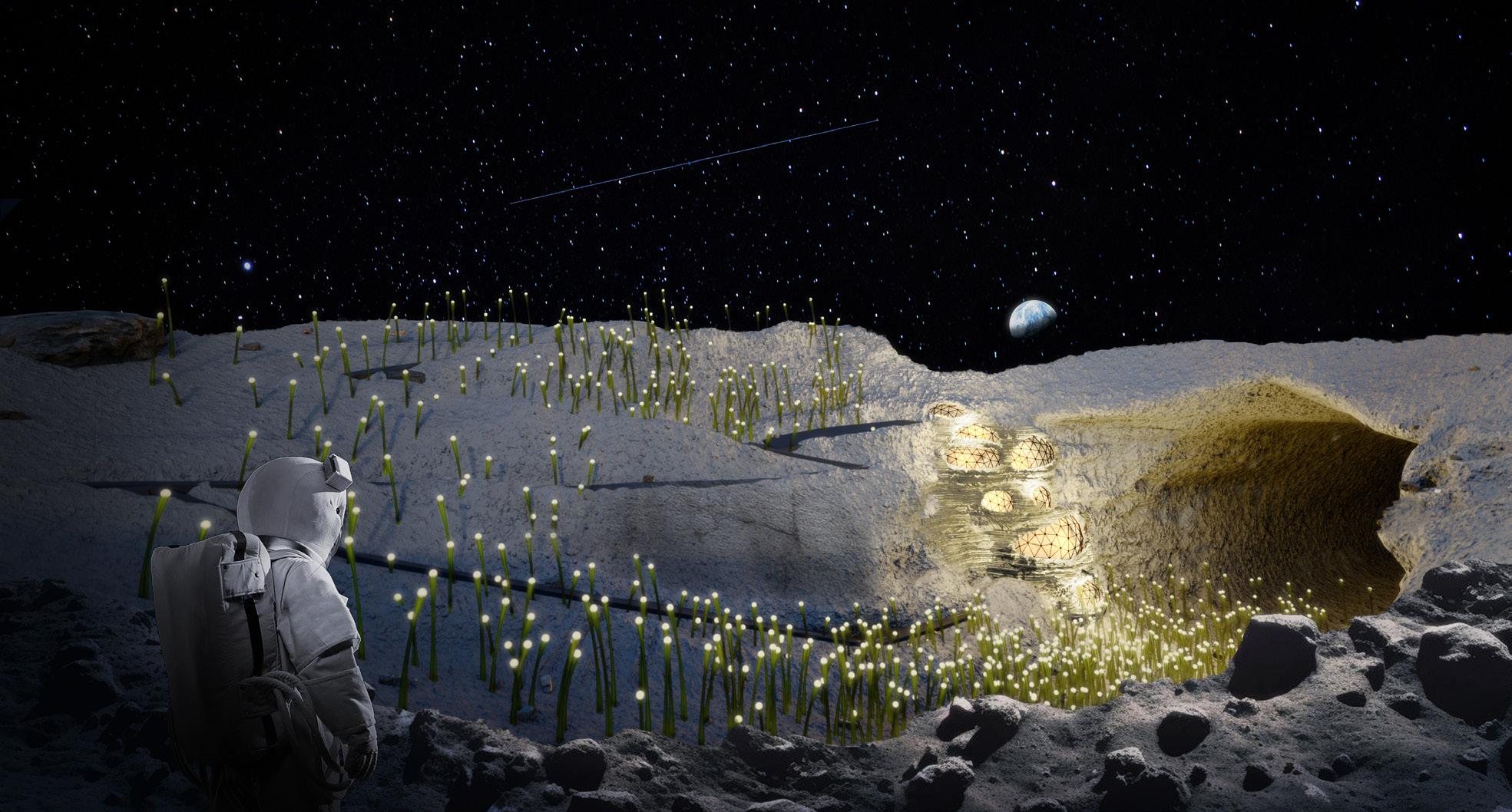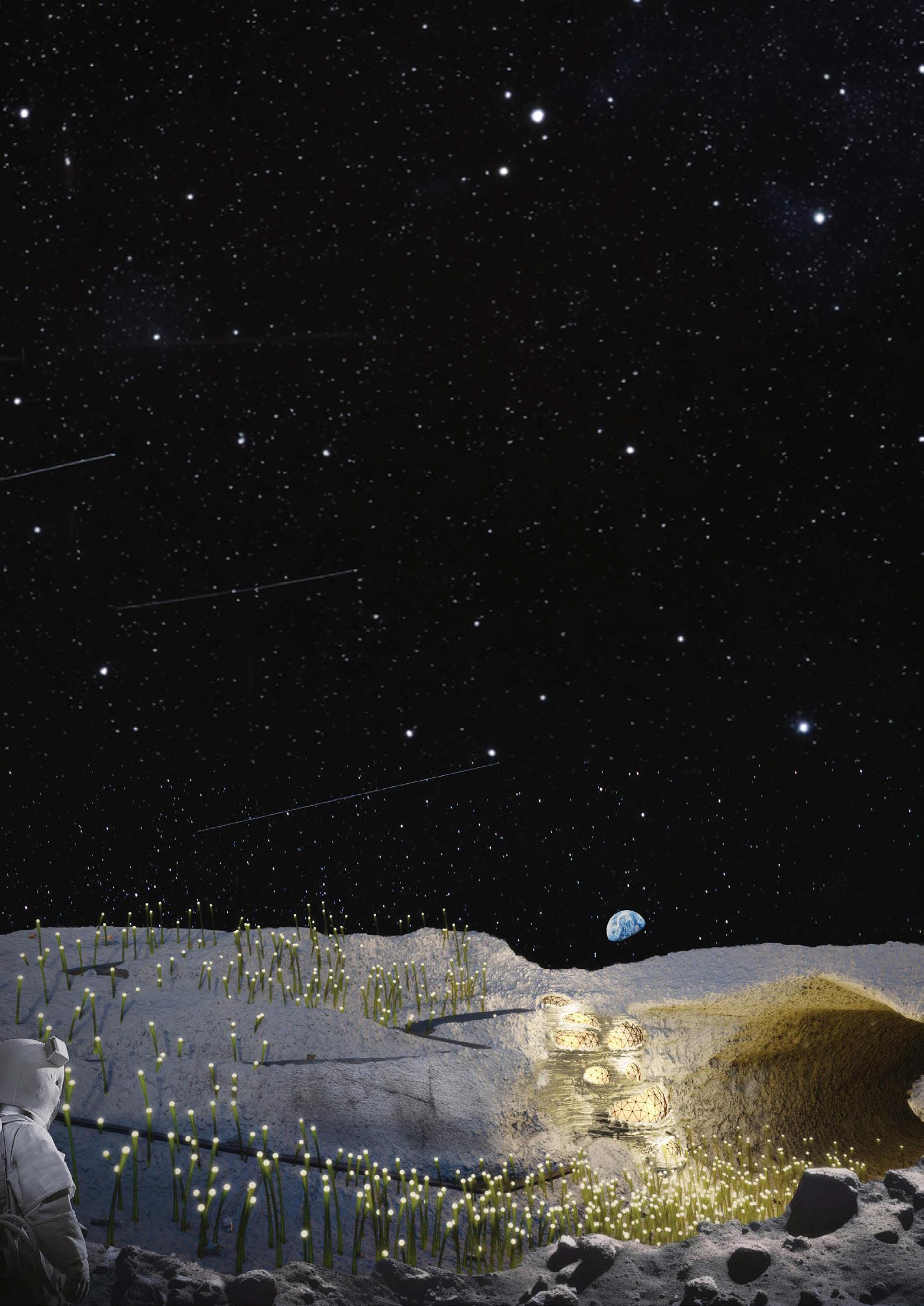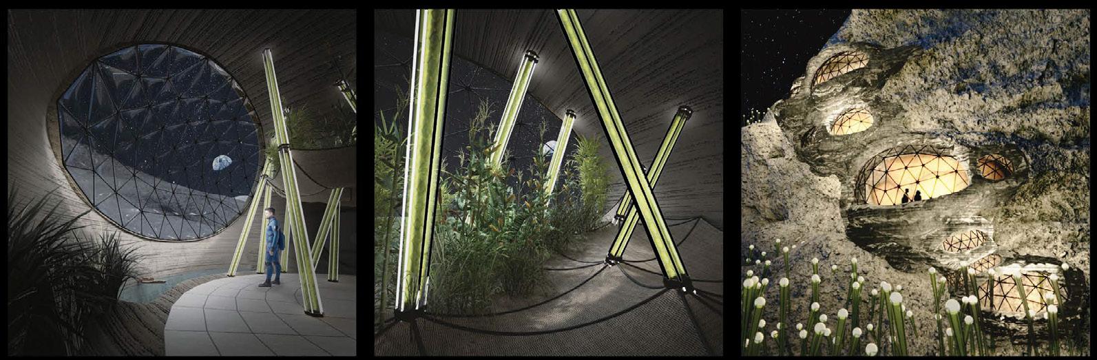 Se visualiza la primera estación lunar dentro del intersticio de un tubo de lava. Integra biorreactores de algas para la producción de biocombustible, optimizados por la menor gravedad lunar para una utilización eficiente del