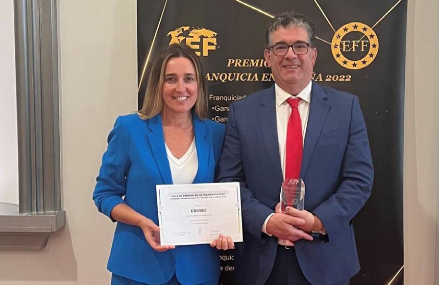 Amaya Ladislao, responsable de Màrqueting d’EROSKI franquícies, i Alberto Cañas, director de Franquícies EROSKI, van recollir el premi al Millor Franquiciador d’Alimentació.