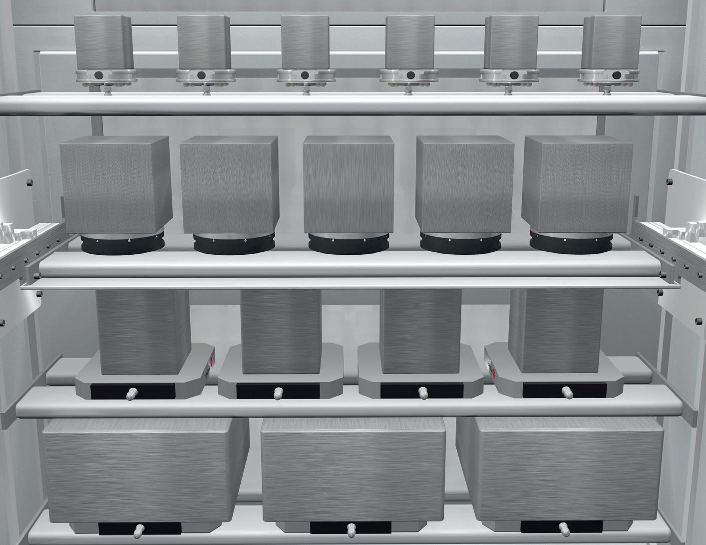 Le diverse dimensioni di pallet standard EROWA vengono depositate in modo ottimale sui piani d'immagazzinamento. L'altezza tra i vari piani viene definita in base alle esigenze.