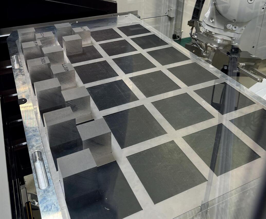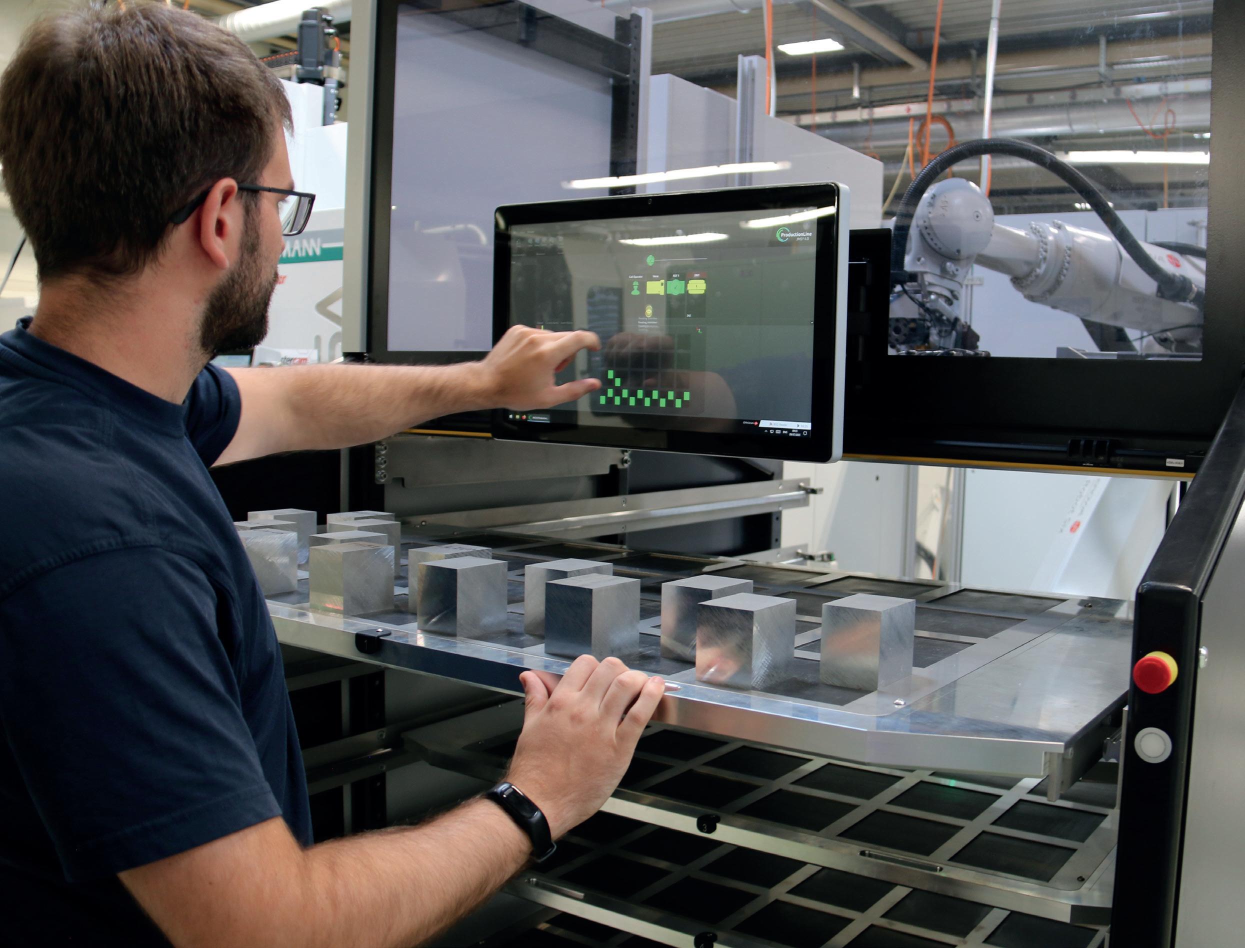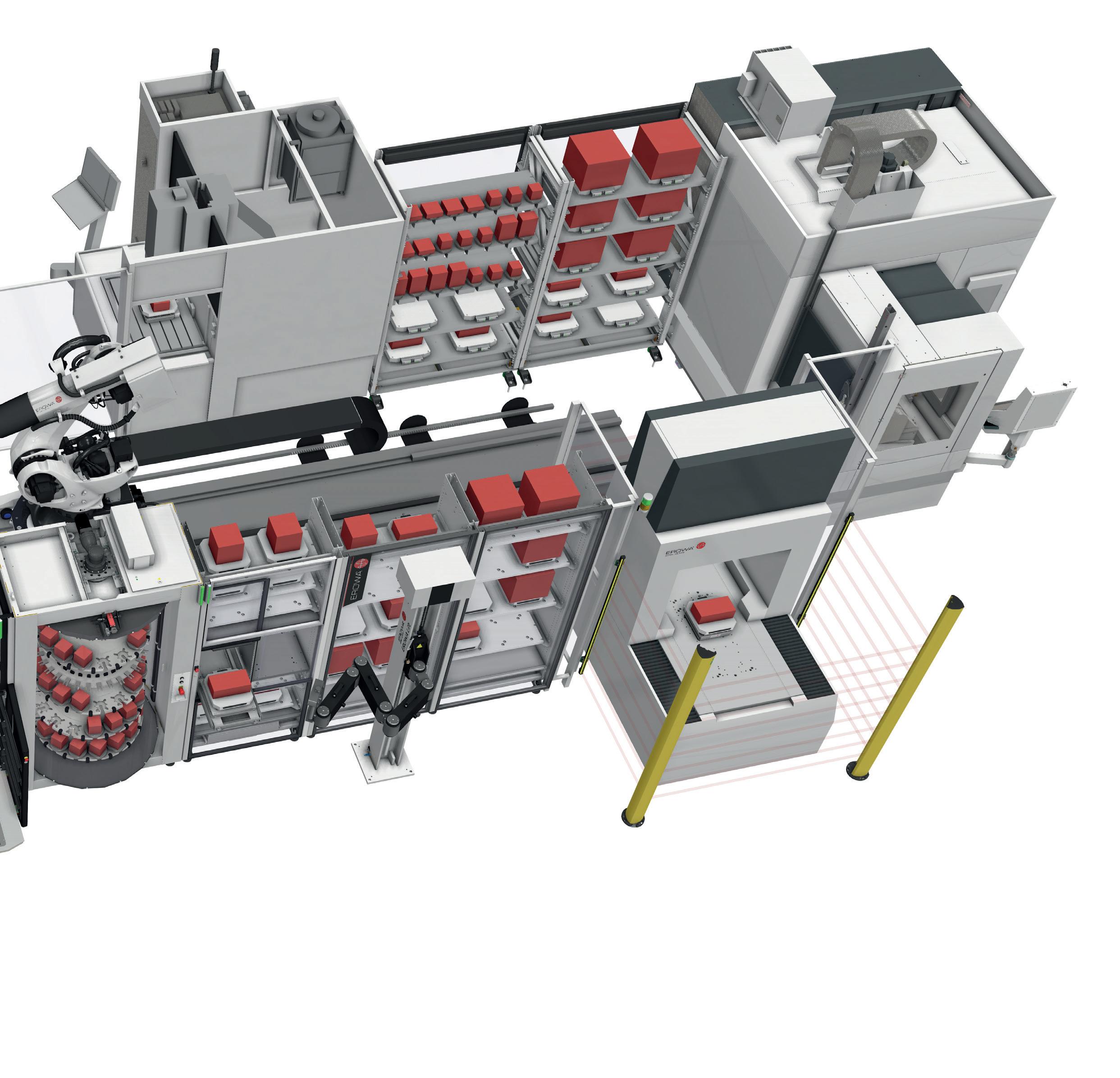 Pour relier plusieurs cellules robotisées individuelles et permettre l‘échange des pièces à usiner y compris pendant les périodes sans personnel, des points d‘accostage intégrés à la cellule robotisée sont adaptés aux véhicules de transport autonome (AGV/AMR). Les pièces usinées peuvent ainsi être récupérées par des véhicules autonomes et transportées, par exemple, vers une cellule de mesure centrale en cabine climatisée pour un contrôle intermédiaire.