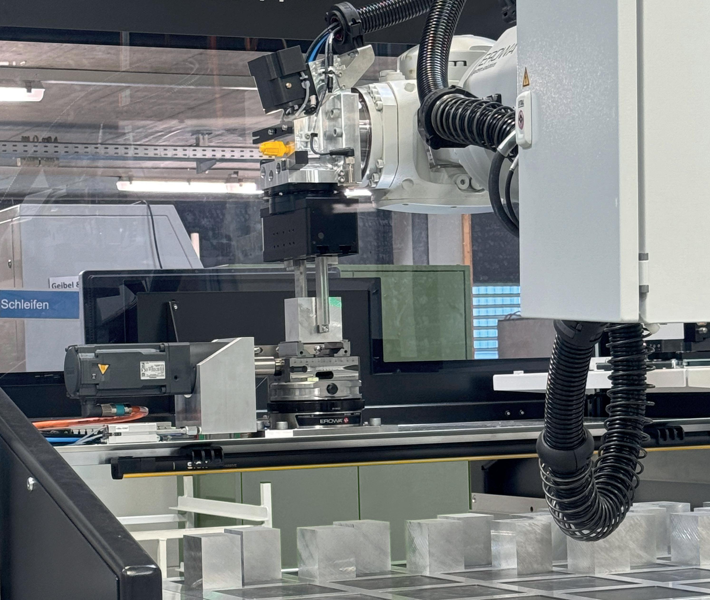 Technologie de préhension interchangeable : Une pince servo intégrée assure une préhension flexible : les pièces, les doigts de la pince peuvent être positionnés avec précision pour chaque opération et fermés avec la force souhaitée. Pour les étapes suivantes, telles que l‘usinage de la deuxième face, les pièces pré-usinées peuvent être serrées de manière classique sur des supports EROWA. Grâce au changement automatique de préhenseur du Robot Six, les palettes peuvent également être transférées vers les machines en « vol ».