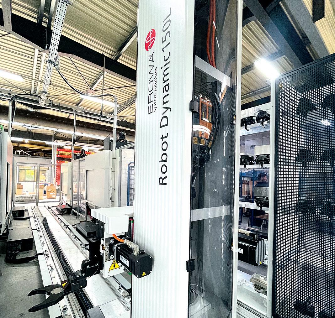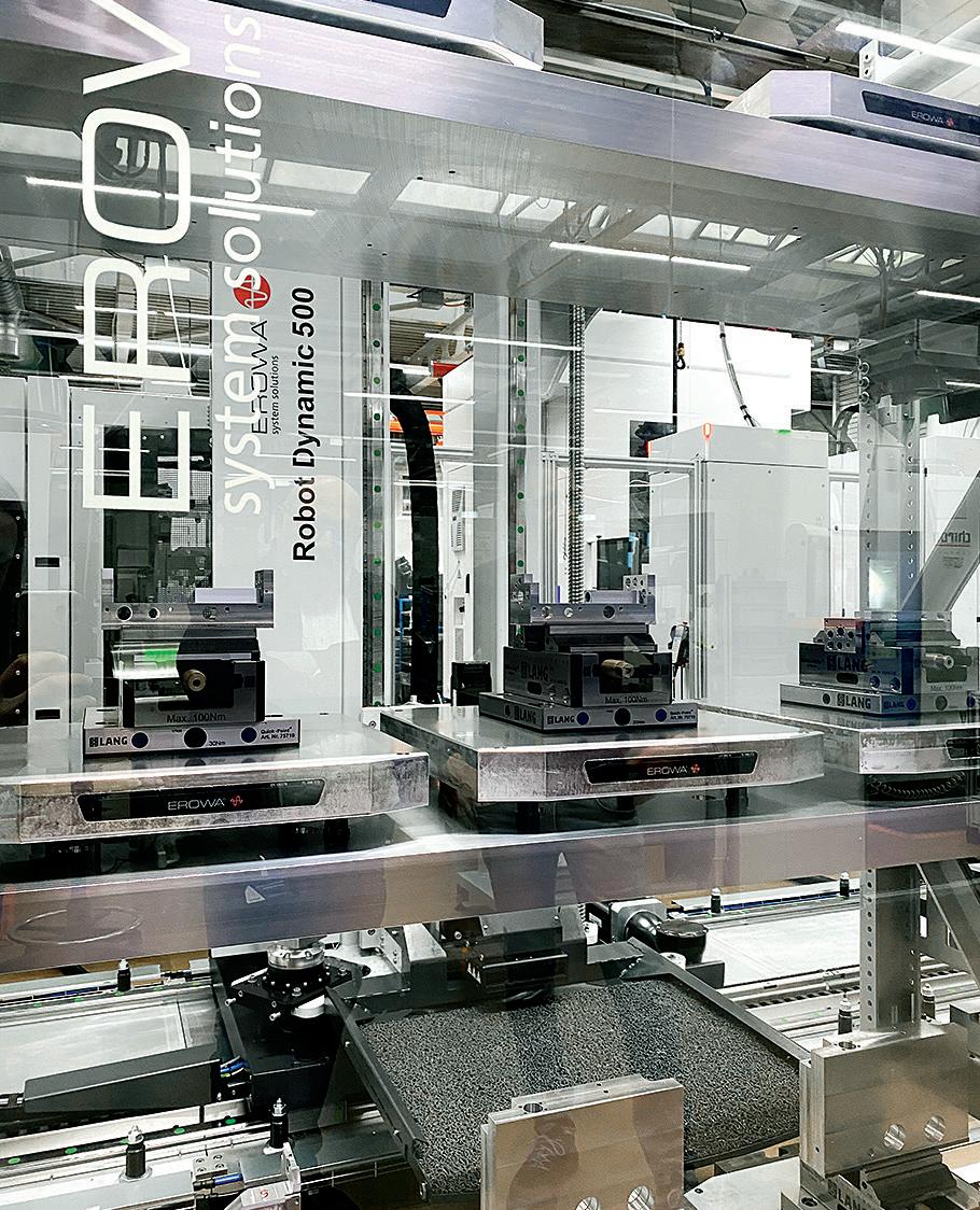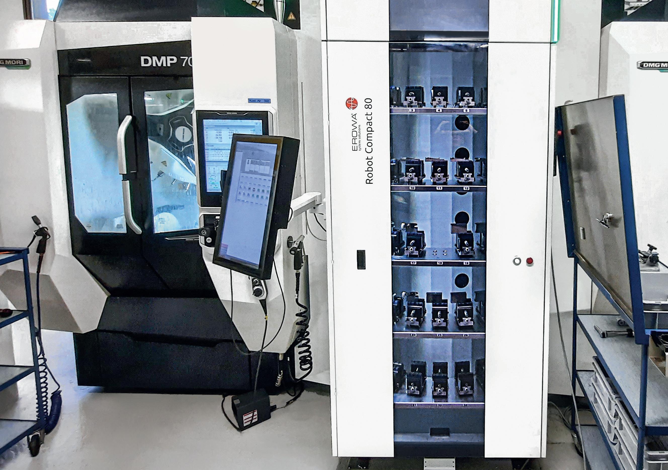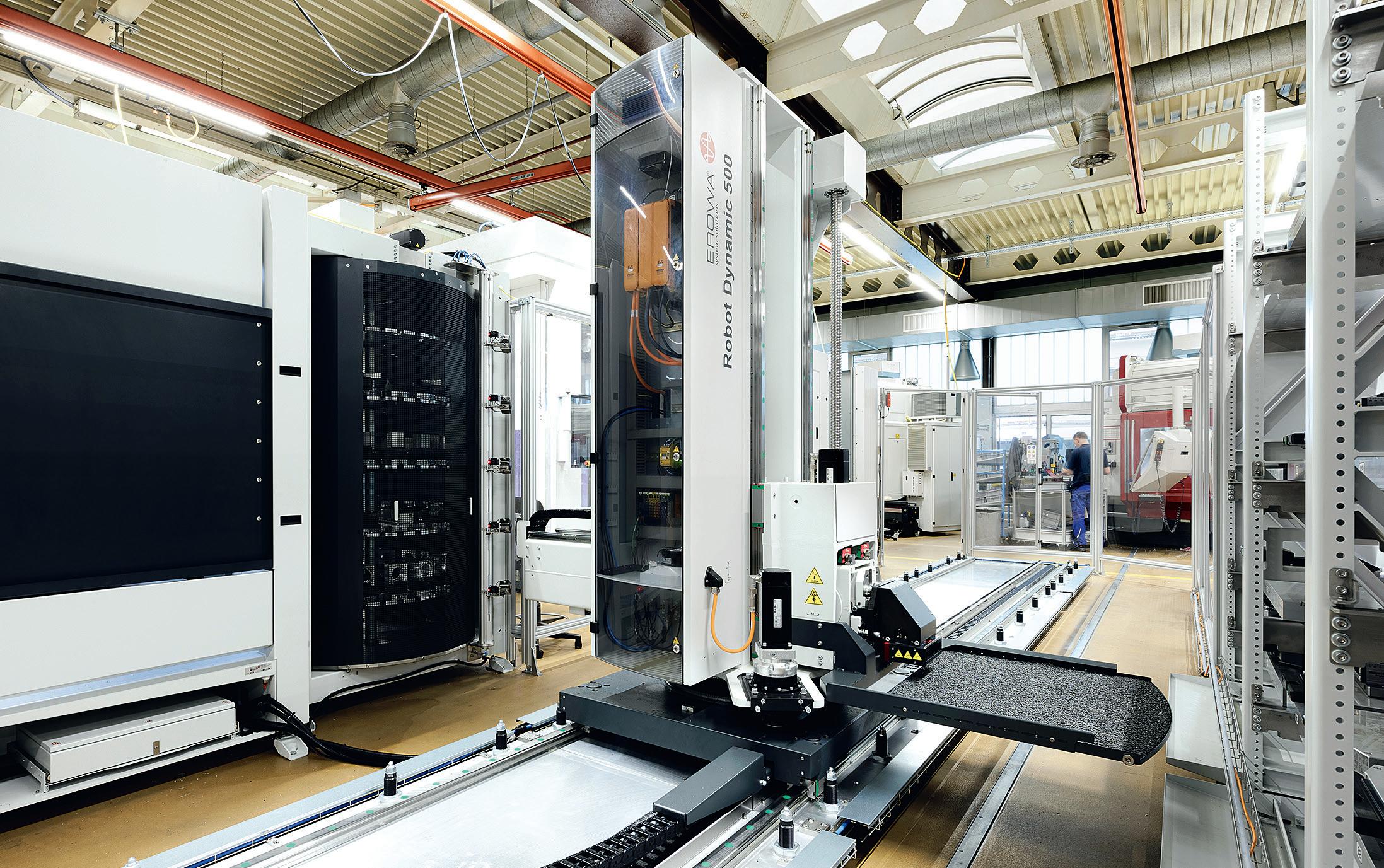 Investiert wurde in ein Heller HF 3500 5-Achs Bearbeitungscenter sowie in einen EROWA Robot Dynamic 500 Linear (auf 9 Metern Schiene mit 91 Magazinplätzen). Gewechselt werden mit dem Roboter Maschinenpaletten, oder über Adapterpaletten MTS 400 Paletten und ITS 148 Paletten.