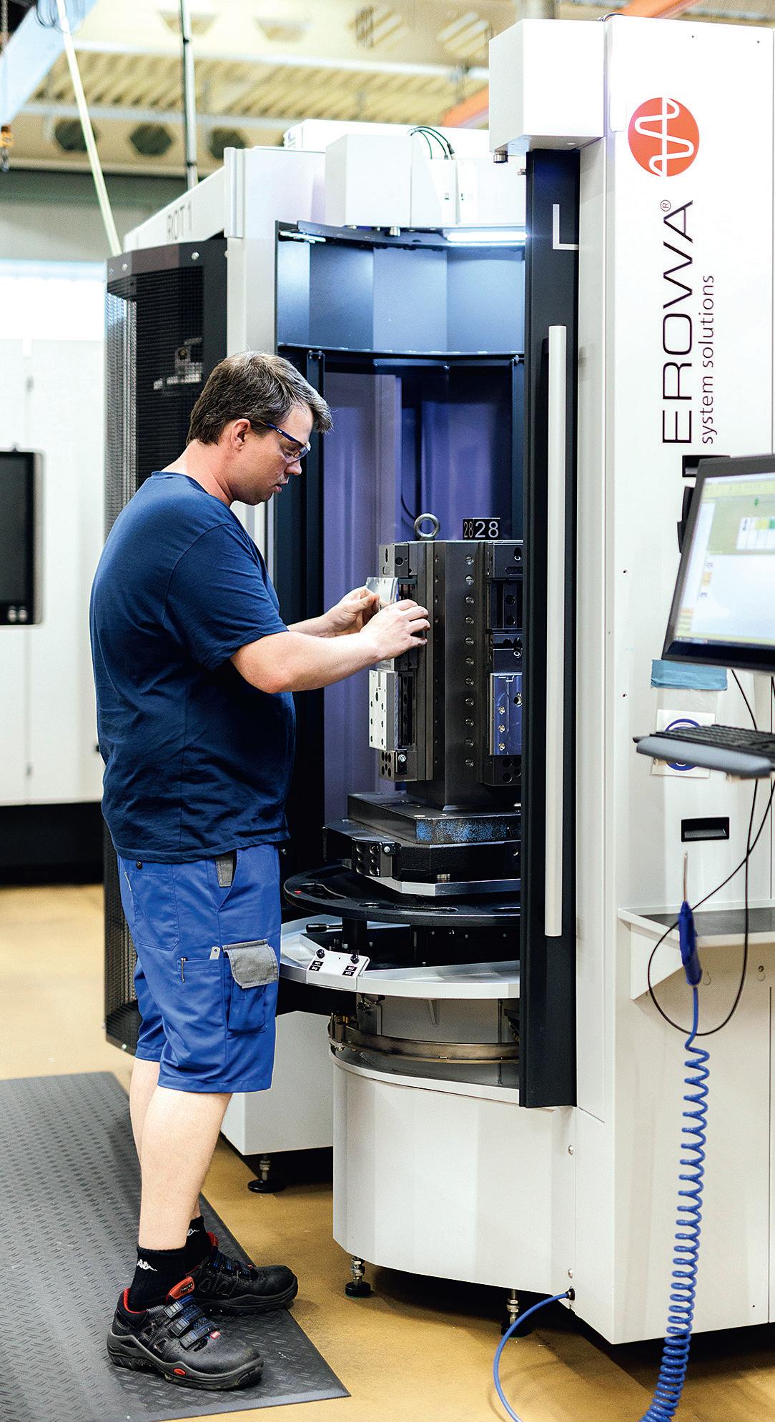 Die enge Kundenbindung entsteht durch die sehr individualisierten Anlagenausführungen. Fast alle Bihler-Produktionssysteme mit ihren kundenspezifischen Werkzeuglösungen sind Unikate, was bedeutet, dass viele benötigte Teile und Komponenten nur ein- oder zwei Mal produziert werden und dann nie wieder. Die Maschinen werden genau so konstruiert und hergestellt, damit sie die Kundenanforderungen erfüllen. «Die daraus entstehende sehr hohe Teilevielfalt bei sehr niedrigem Volumen ist eine der grossen Herausforderungen. Für die Konstruktion, dann auch für deren automatisierte Fertigung und die Qualitätssicherung», erklärt Paul Höldrich, Fertigungsleiter bei Bihler. Gerade deshalb setzt Bihler auf langjährige Partnerschaften mit Lieferanten und Technologiepartner, wie EROWA. «Wir profitieren so voneinander und können uns gemeinsam weiterentwickeln», so Höldrich.