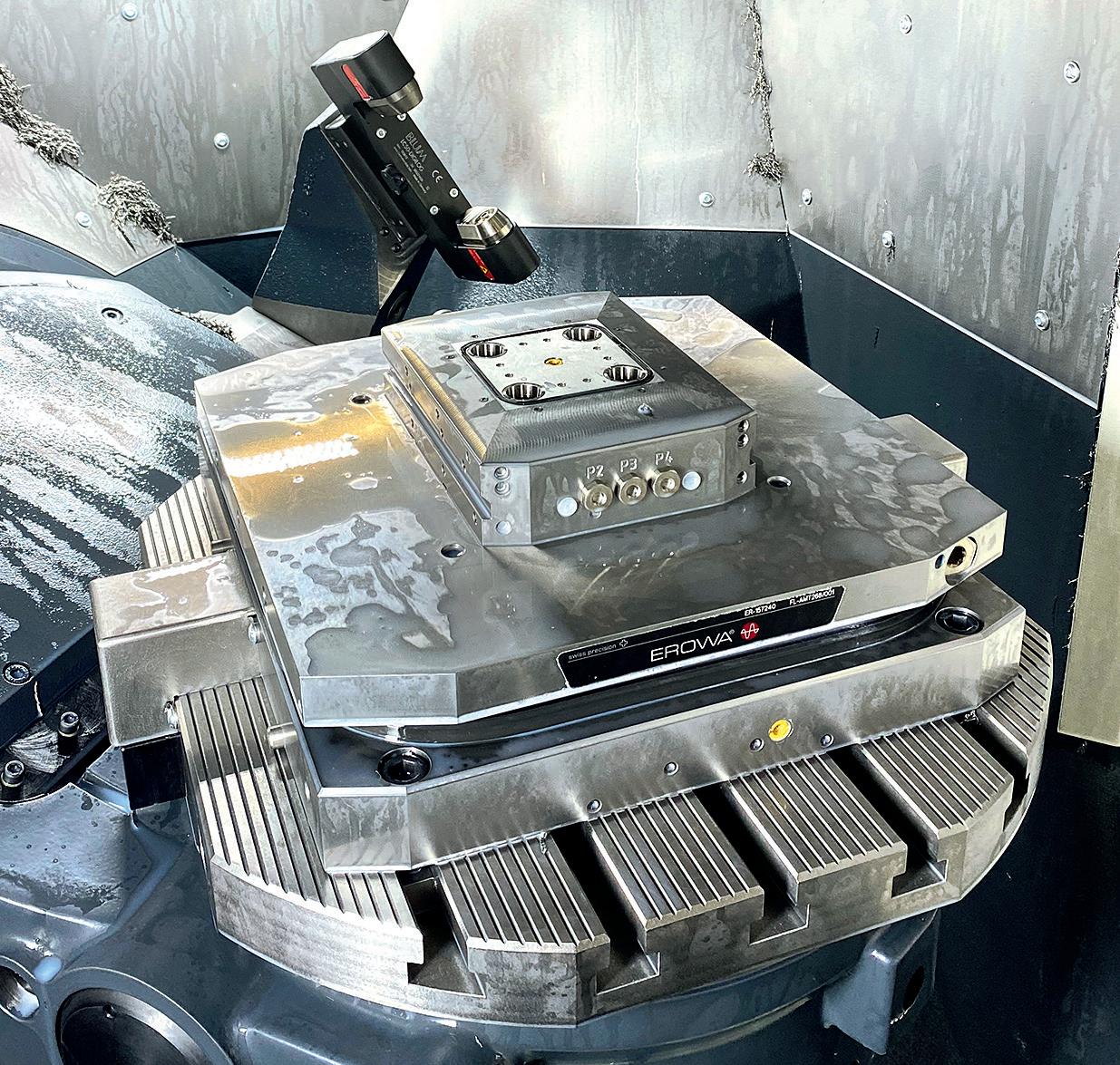 «Grosse Werkstücke und Spannvorrichtungen befestigen wir auf MTS-Paletten. Kleinere Werkstücke palettisieren wir auf dem EROWA ITS 148 System. Mit der Verwendung von Adapterpaletten werden diese Werkstückträger durchgängig in das System integriert. So halten wir die Umrüstzeiten auf einem Minimum», so Schärer.