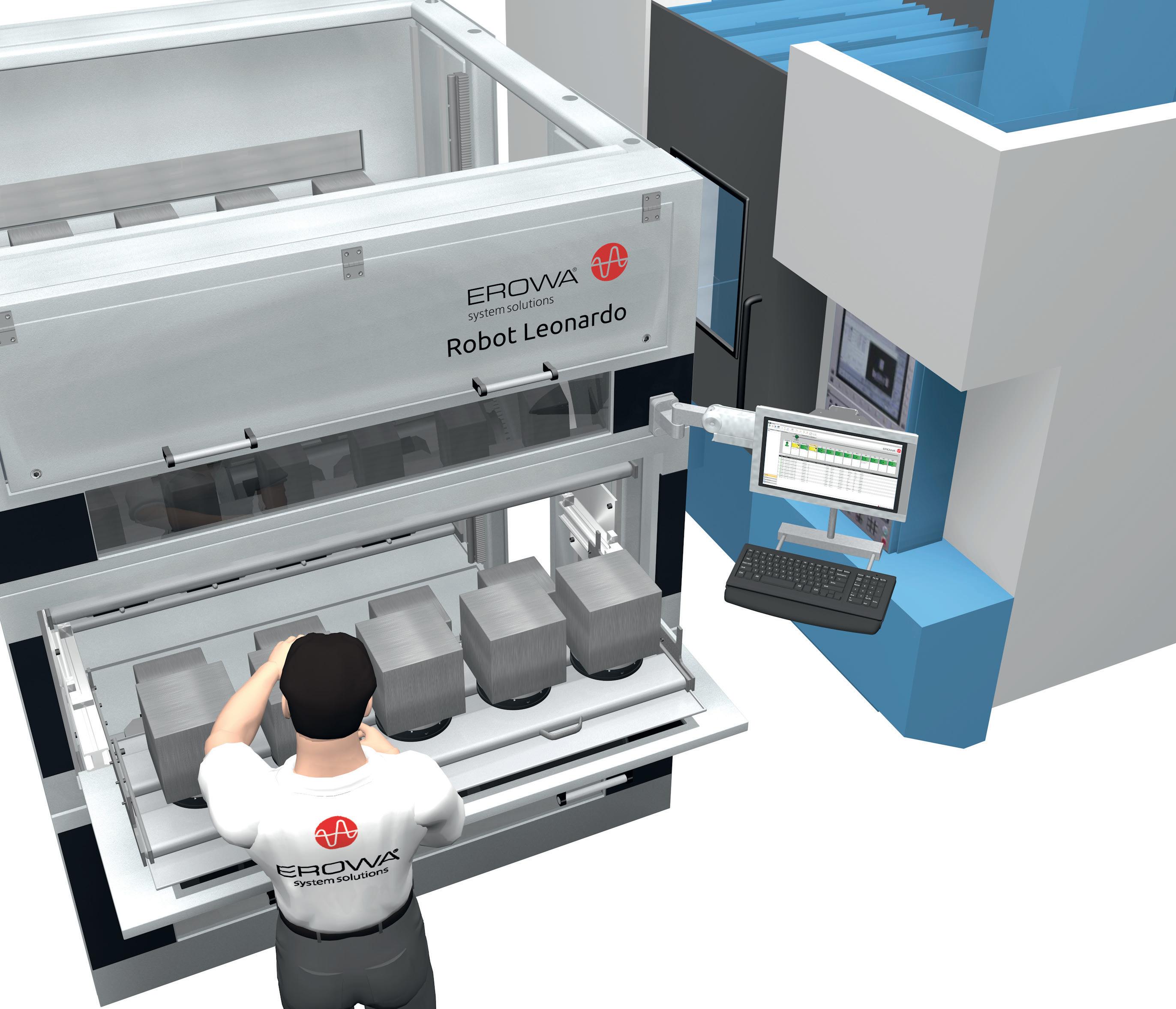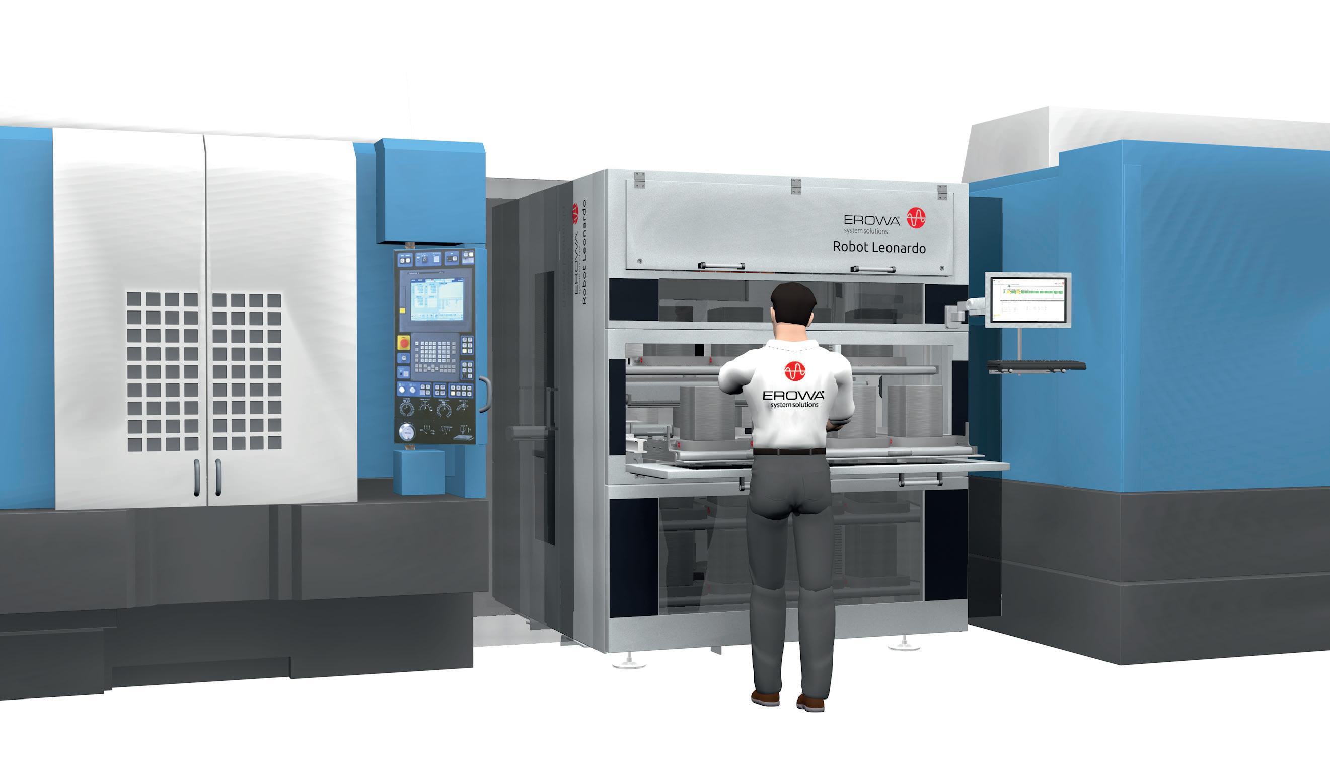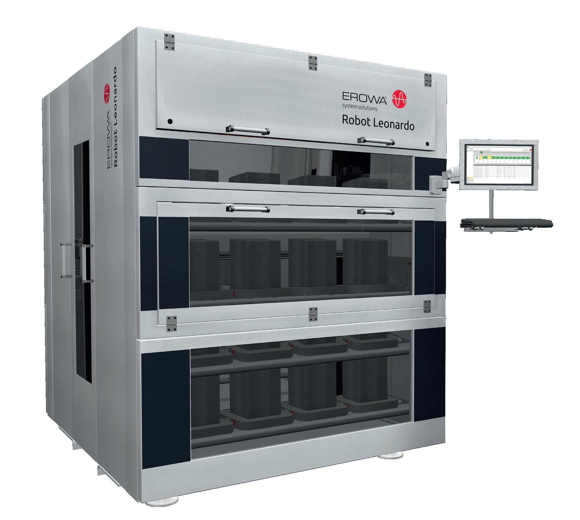Leonardo ist ein Paletten-Handlinggerät mit MehrebenenMagazinen. Das Transfergewicht ist 120 kg. Die X-Achse weist einen langen Fahrweg von 1565 mm auf und reicht damit auch in grosse Maschinen.