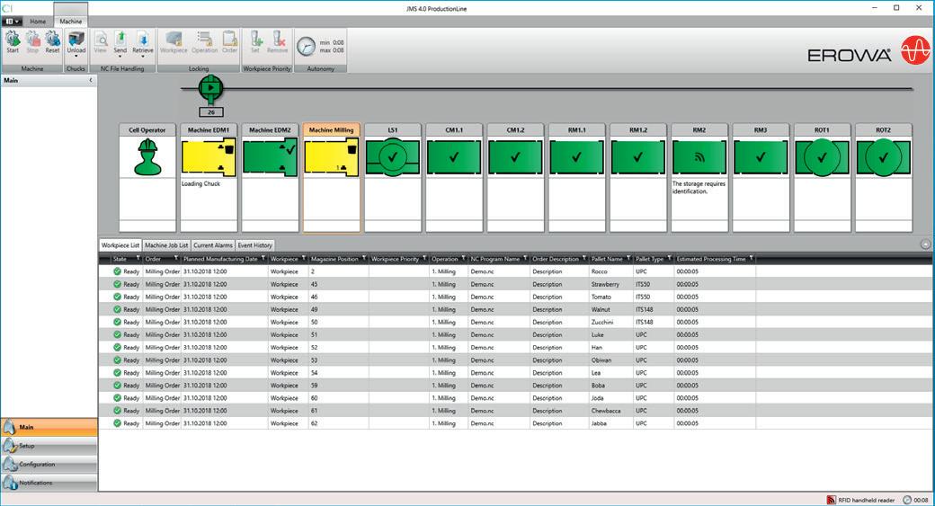 Das EROWA Prozessleitsystem JMS 4.0 bietet die Grundlage zur Erhöhung der effektiven Maschinenzeit. Durch das Verbinden sämtlicher Daten und das Steuern des kompletten Fertigungsprozesses werden Prozesse beschleunigt und mögliche menschliche Fehler minimiert.