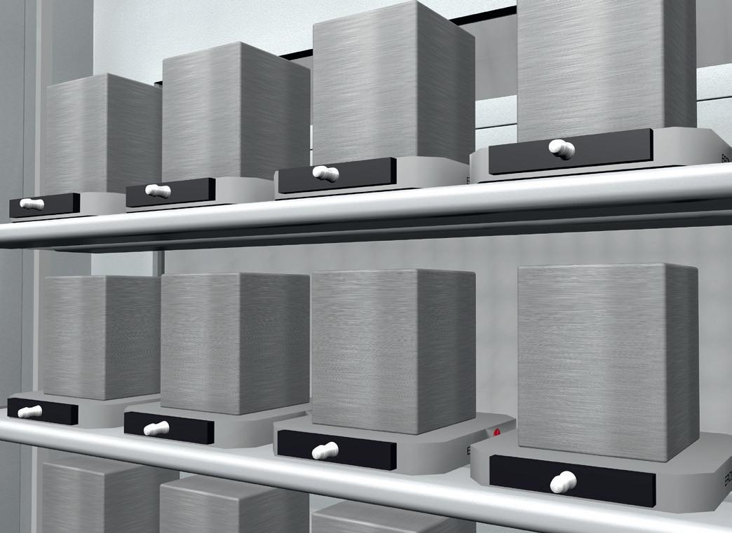 Die verschiedenen EROWA Standardpalettengrössen werden optimal auf den Speicherebenen abgelegt. Je nach Bedarf werden die Ebenen in der Höhe aufeinander abgestimmt.