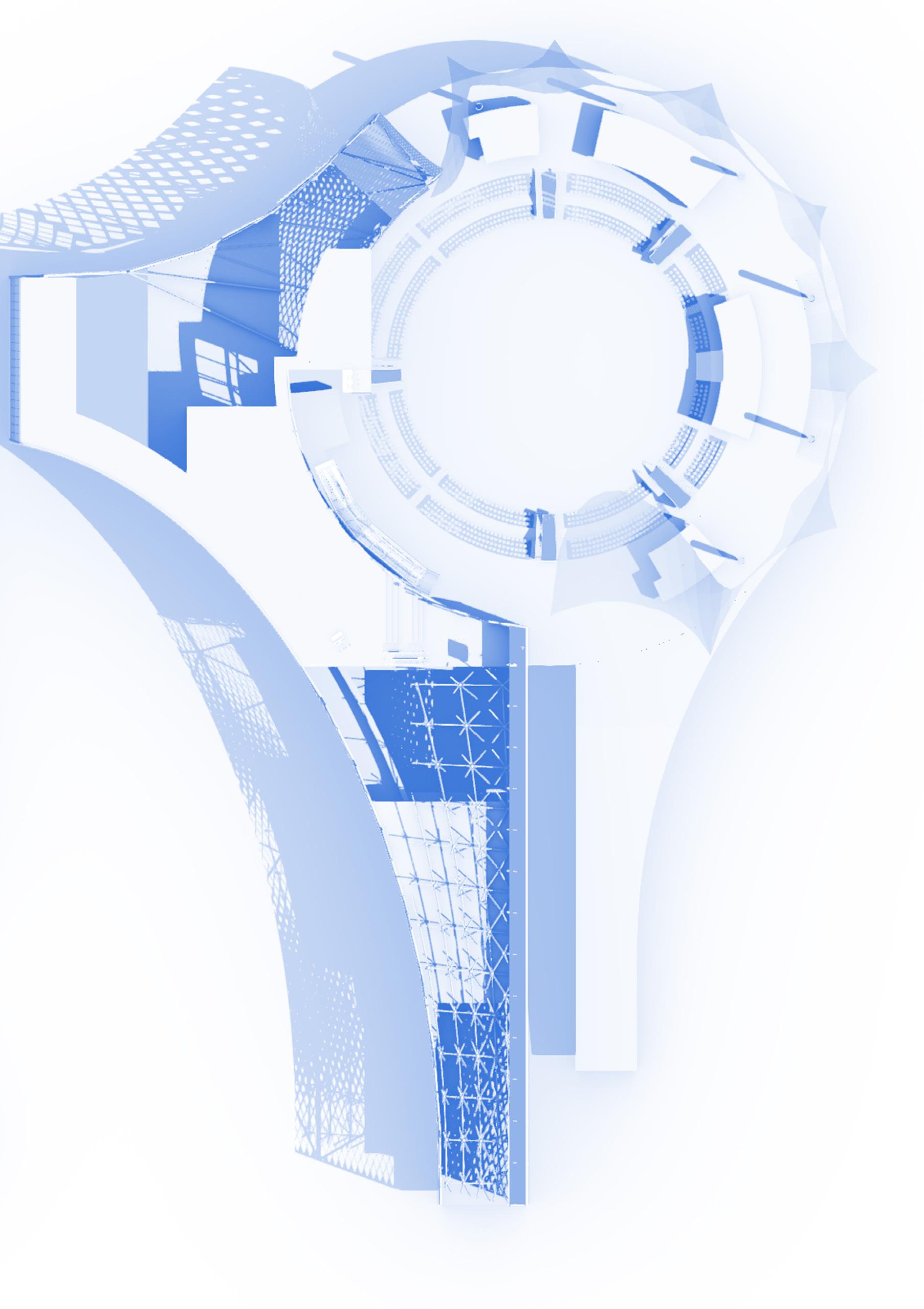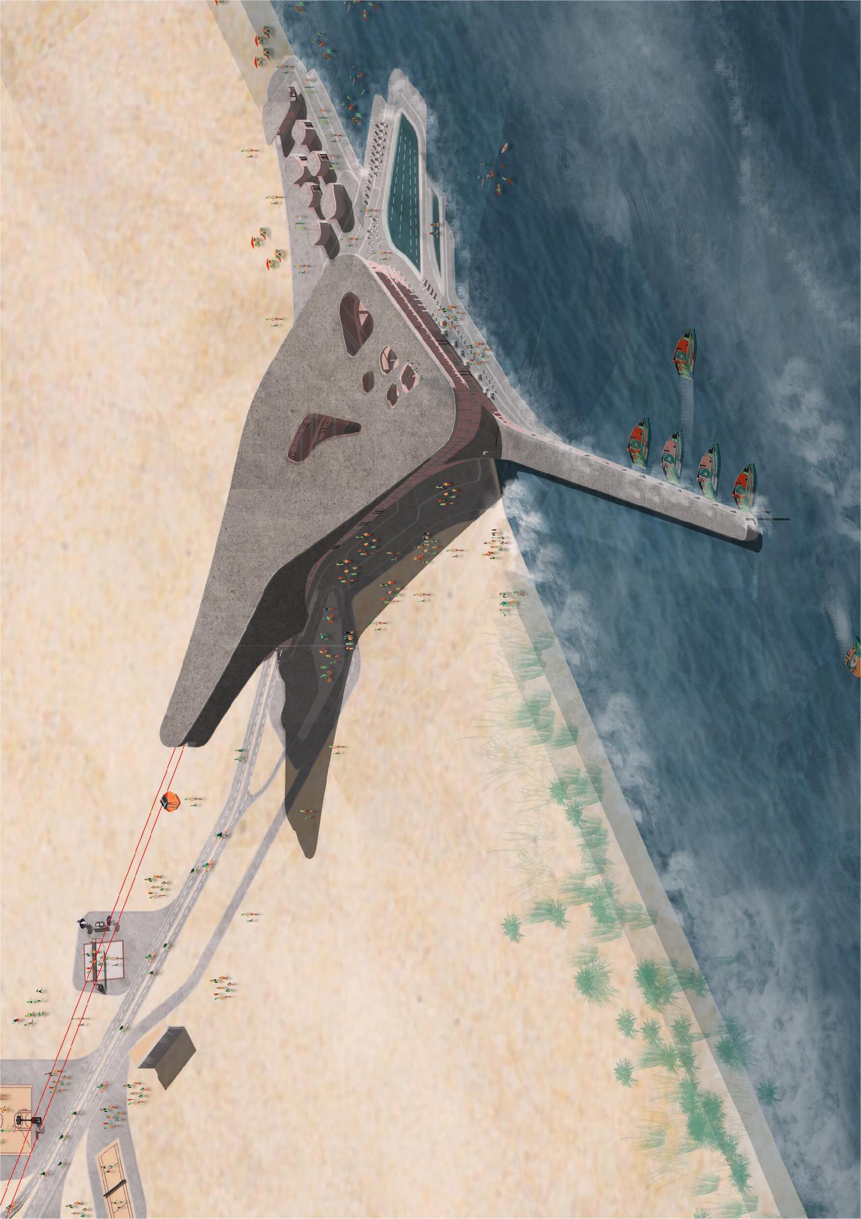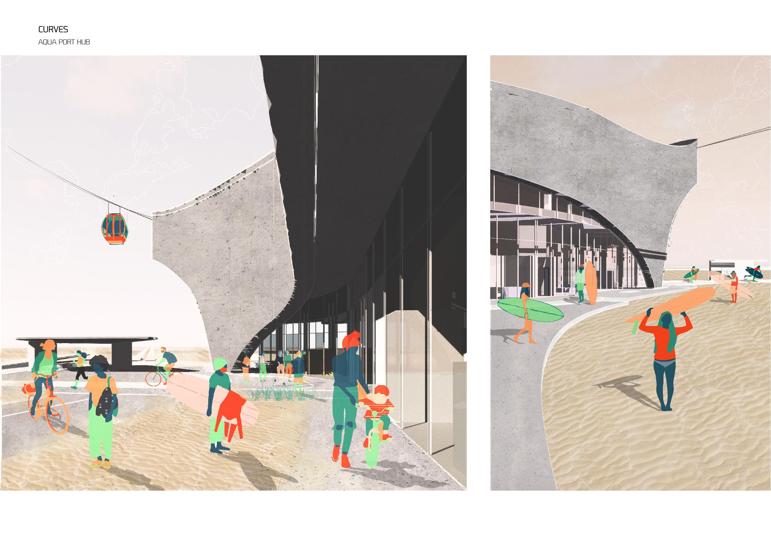 The building is a manifestation of a topographical analysis of the growing artificial island Maasvlakte and a tidal study based on the water’s motion, already making the site a Surfing point. The proposal combines two main functions: transportation Hub and Water Sport Center. The form, influenced by a maritime design language, sits on the shore like a sea creature, serving as a medium between water, air and land means of transportation. Therefore, it becomes a link between the City and the Port by becoming a public space in a surreal industrial context. The sculptural nature of the building contributes to the monumental atmosphere. The fluidity of the form connects three branches: a harbour platform extended in the sea, a sea pool and a vertical branch serving as a tunnel for the cable cars.