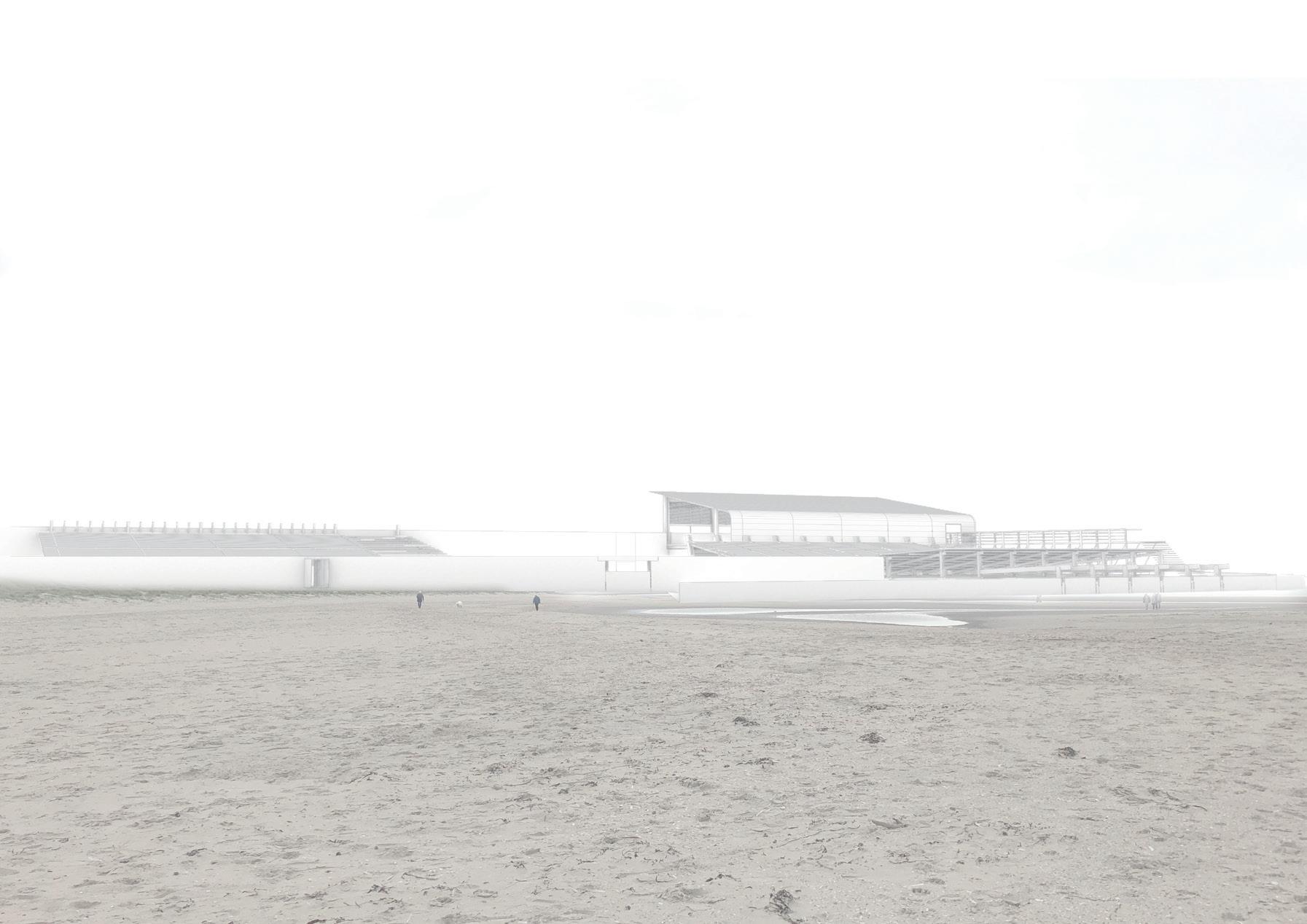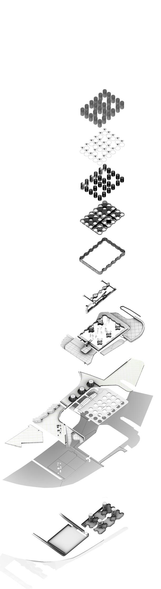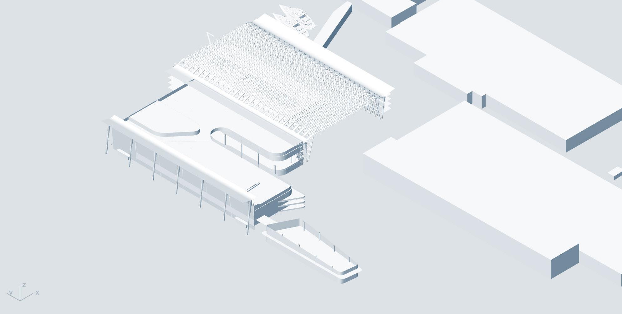 The building is a manifestation of a topographical analysis of the growing artificial island Maasvlakte and a tidal study based on the water’s motion, already making the site a Surfing point. The proposal combines two main functions: transportation Hub and Water Sport Center. The form, influenced by a maritime design language, sits on the shore like a sea creature, serving as a medium between water, air and land means of transportation. Therefore, it becomes a link between the City and the Port by becoming a public space in a surreal industrial context. The sculptural nature of the building contributes to the monumental atmosphere. The fluidity of the form connects three branches: a harbour platform extended in the sea, a sea pool and a vertical branch serving as a tunnel for the cable cars.