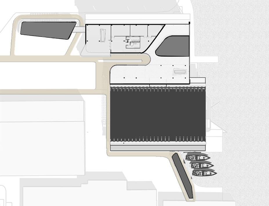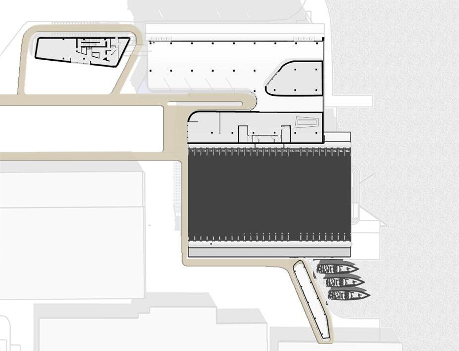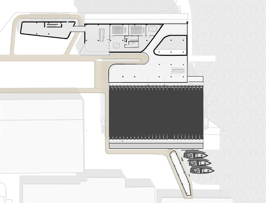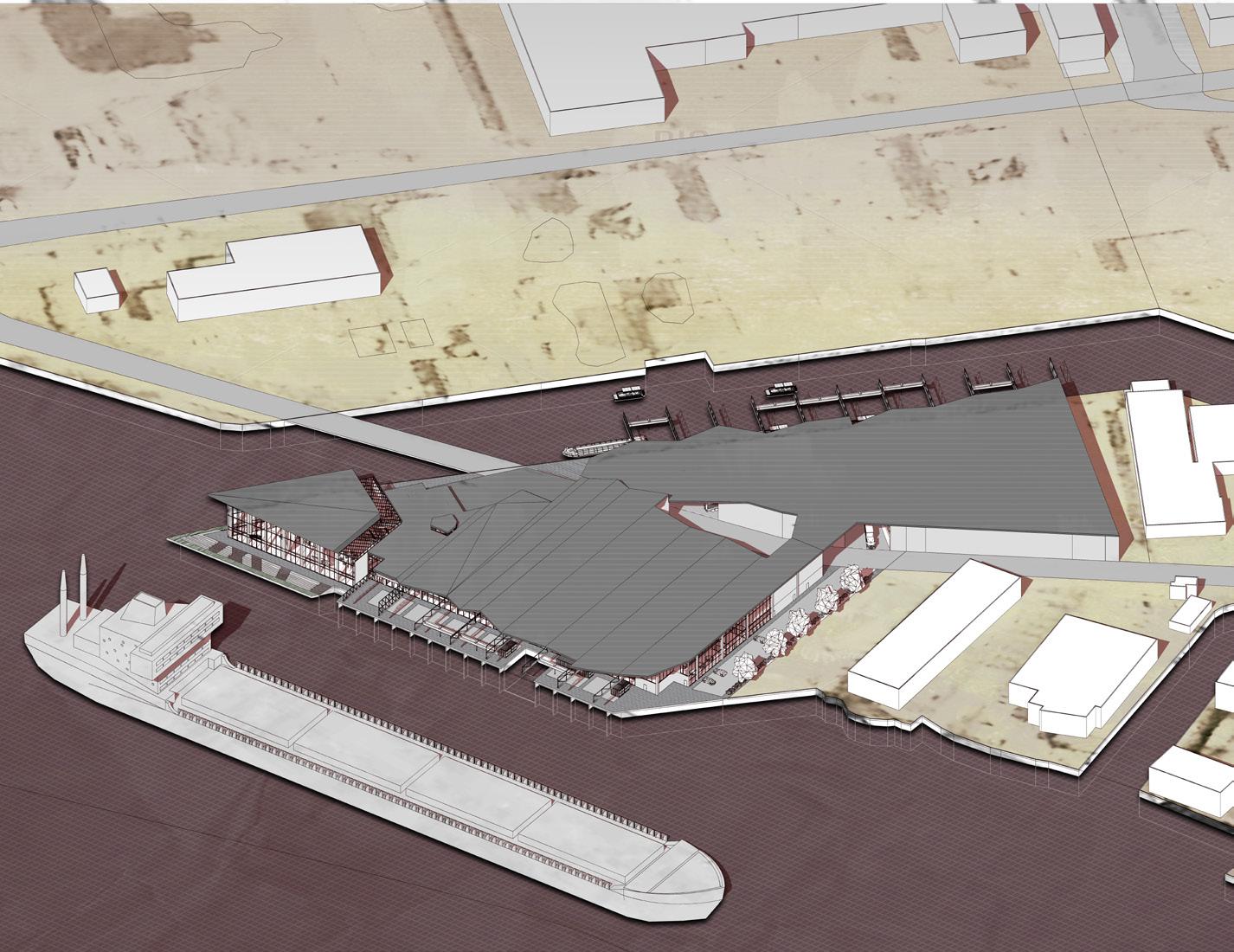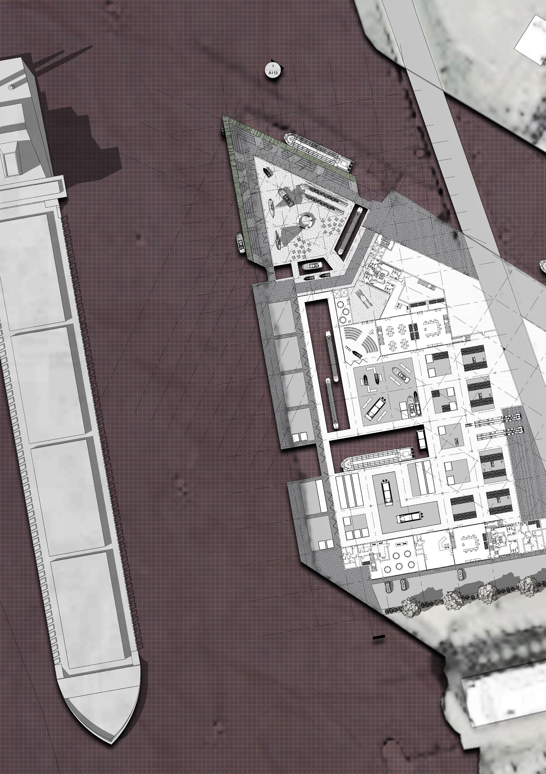 Situated at the heart of Rotterdam, in the area of Rotterdam Stadshaven, and making use of the original dry dock as main production studios, the facility houses two key programs: a campus volume and a production volume, where communal spaces are interwoven between the two voids. The plan shows the gradient of privacy between the academia sphere, the shared area, and the public retail and production house. The project expands from the existing dry dock located on the site as a means of developing organization rules, forming the building layout into a production nucleus into the outer peripheral layout of public spaces that connects the other end of the facility: the institution. Inner canals are also proposed within the buildings, stimulating the sense of flow and community among the studentworkers.