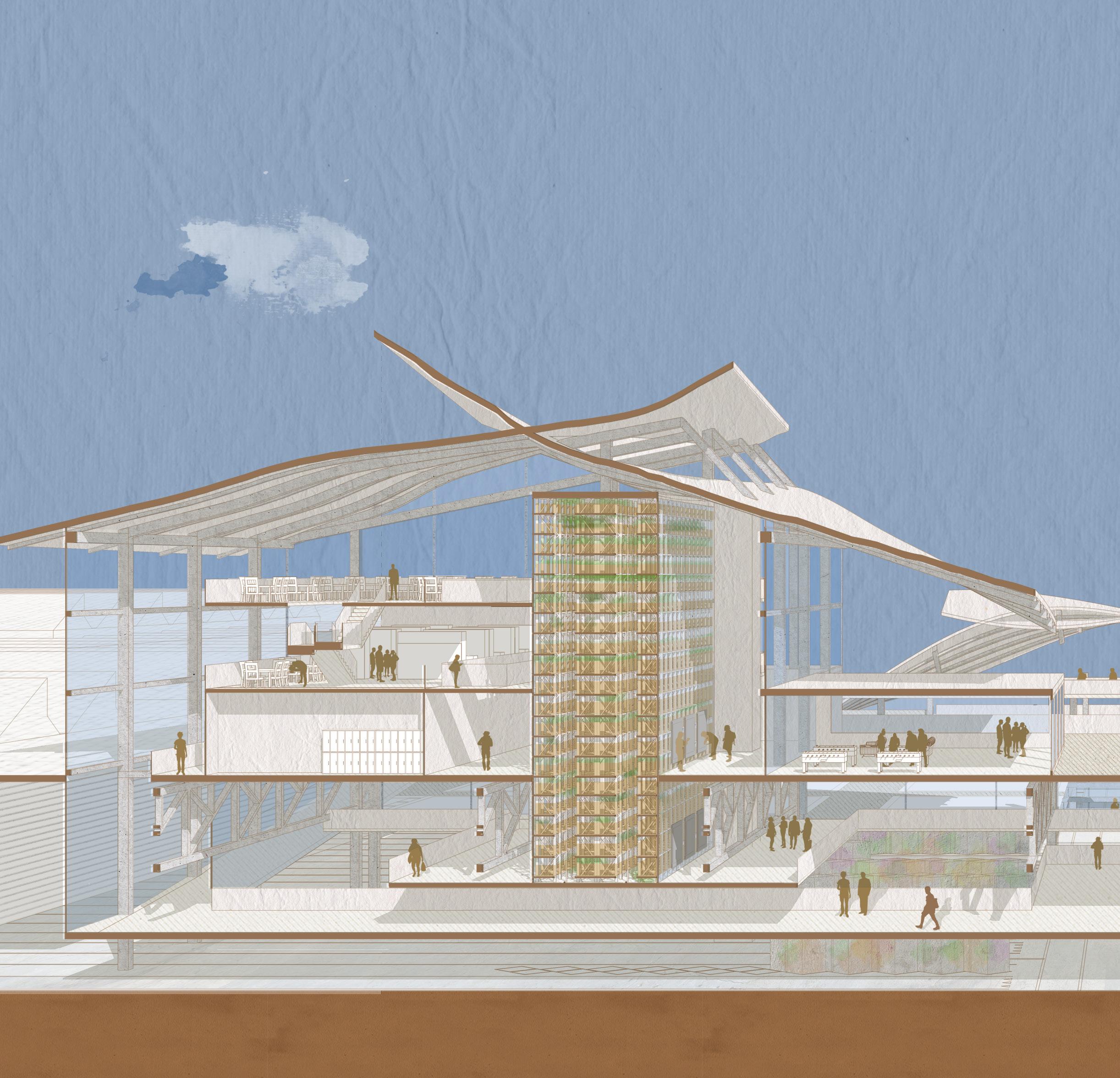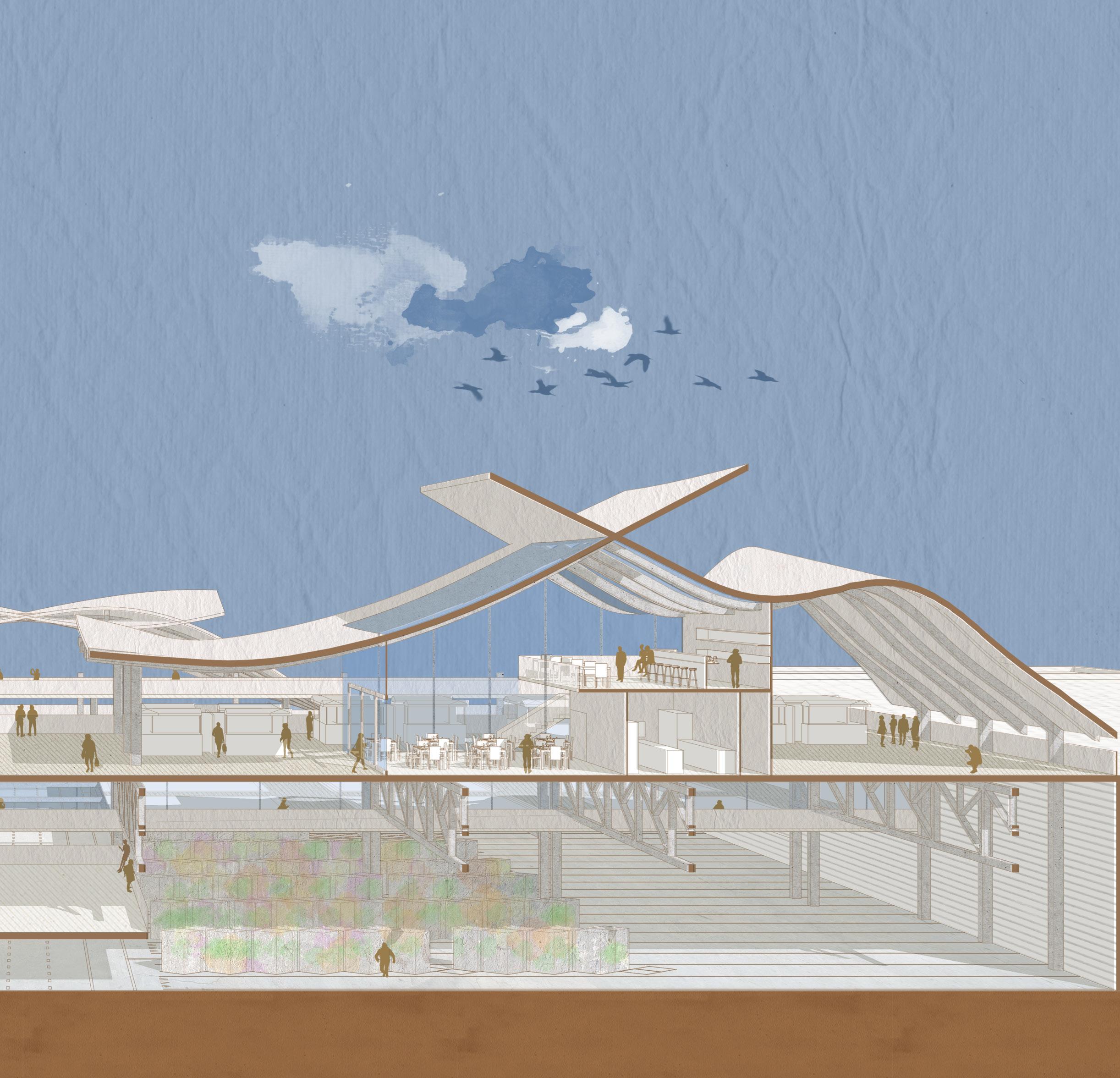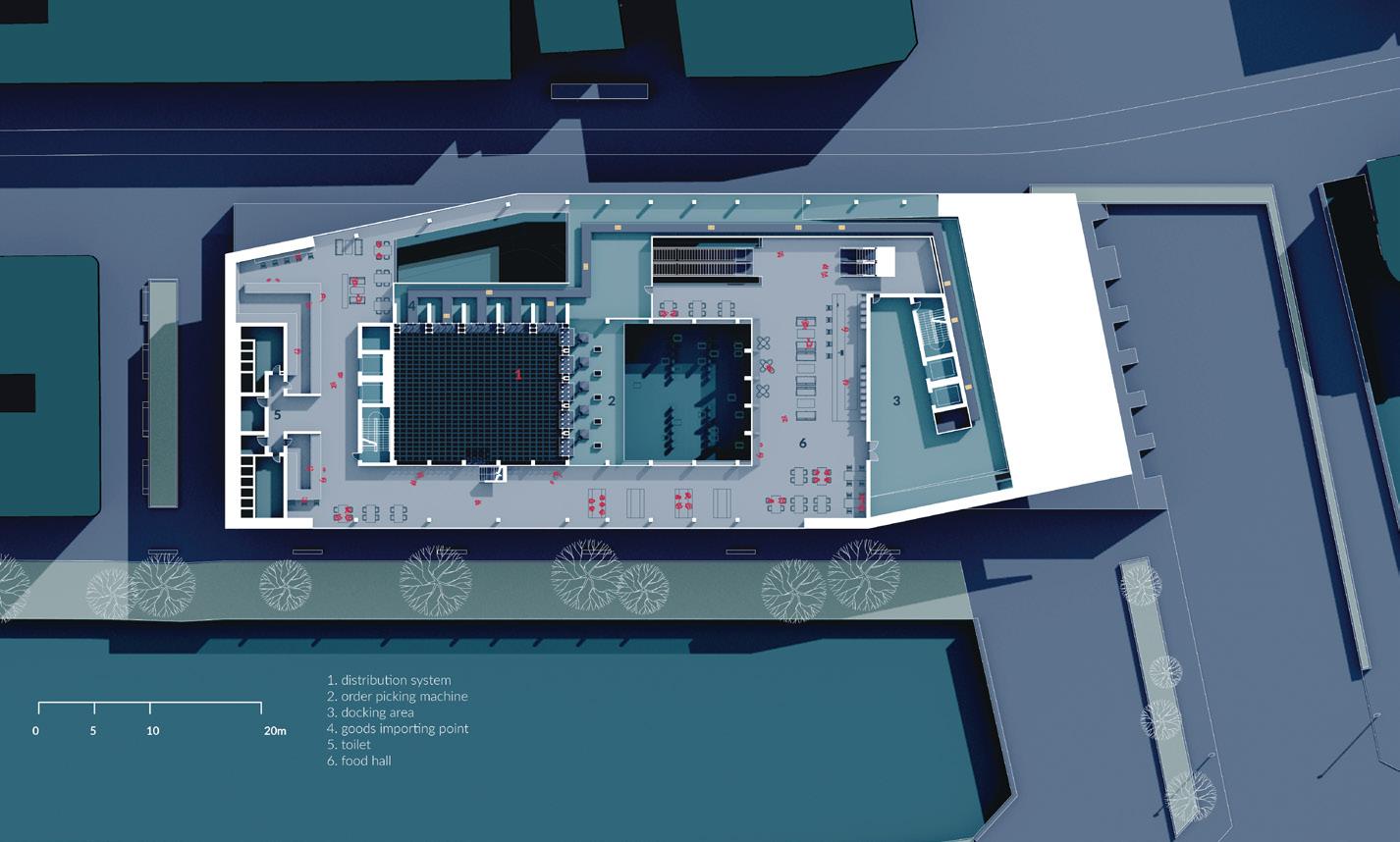 With the increase of online shopping and the change in freight transportation, physical markets are going to be significantly reduced in their number and size. Considering though their social and commercial values for communities, markets will be retained through the incorporation into the transit station. The design intends to combine activities of both autonomous machines and humans. Human activity patterns are brought to the heart of this industrial landscape. The building typology of the transit station would become an essential infrastructure contributing to our daily life, community and sustainability of urban districts.