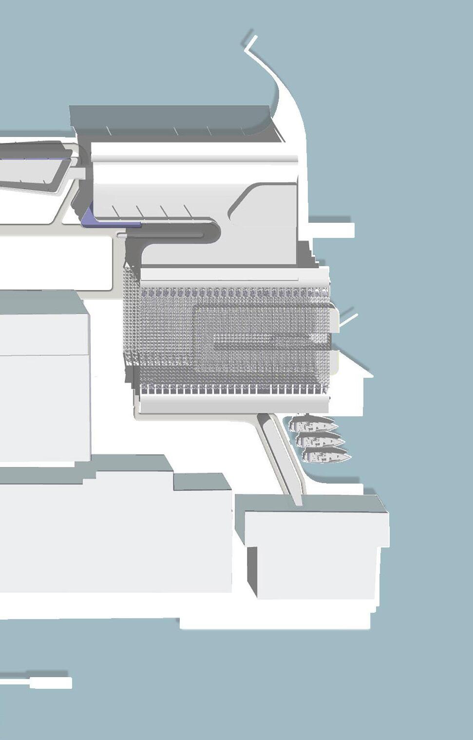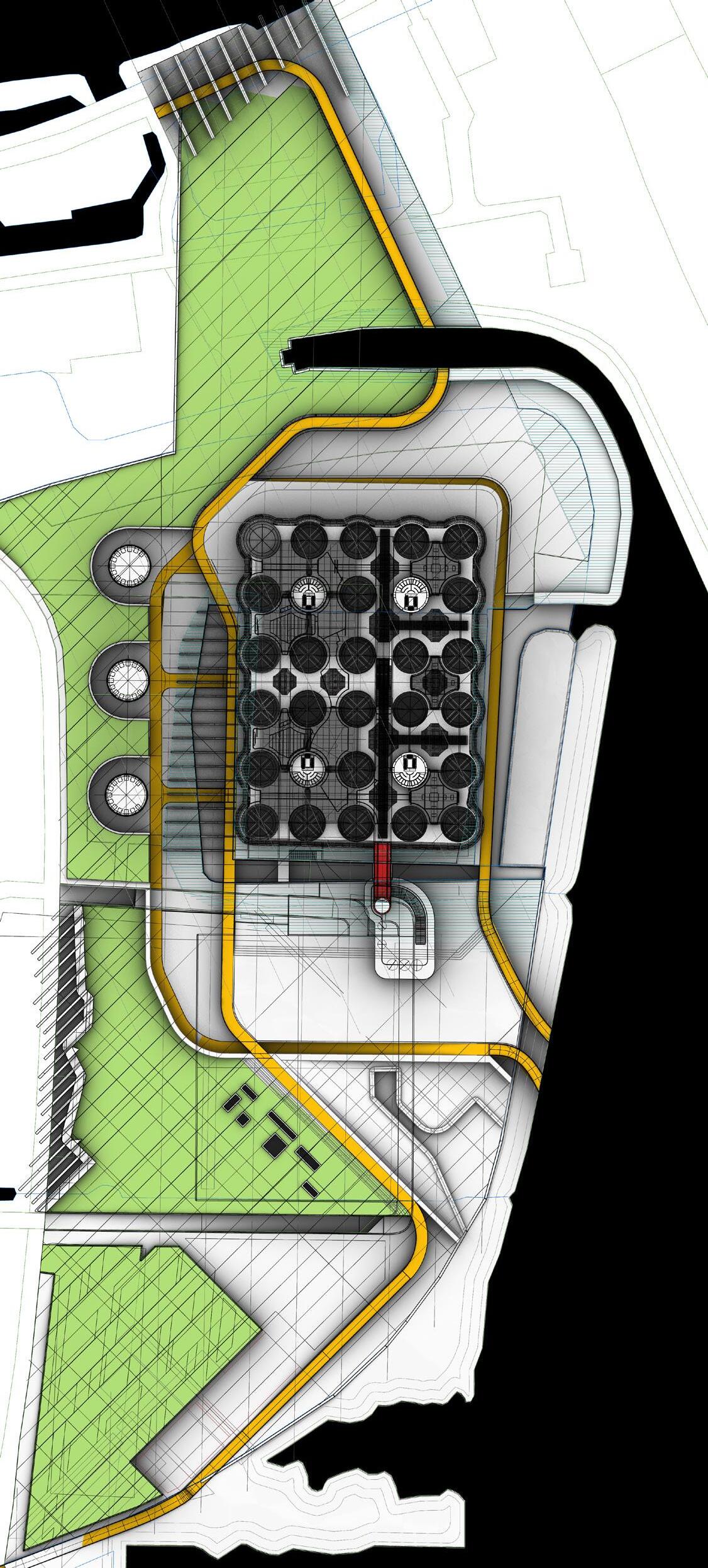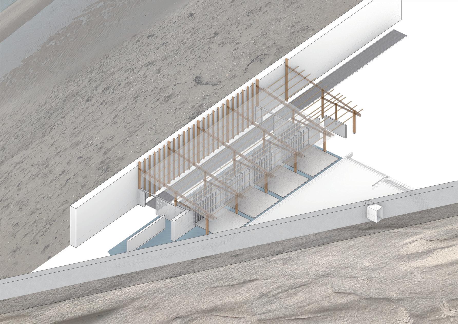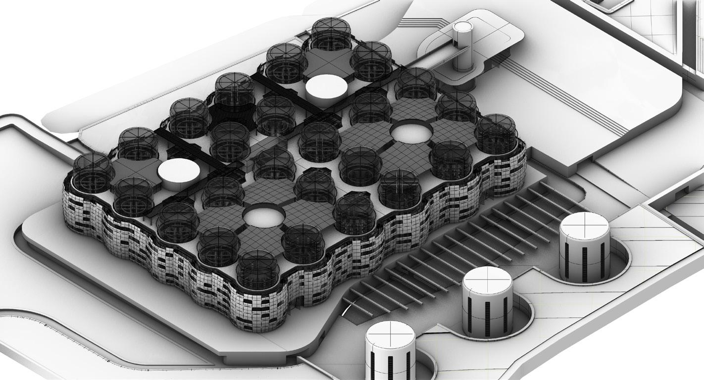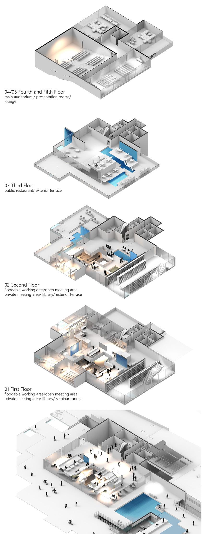 The multifunctional building also reveals potentials for a clubhouse facility for retail and recreational usage as well as the turbines for the cultivation of hydro and tidal power draws both from the site and the europort that will support electricity demands for the institute and production house.