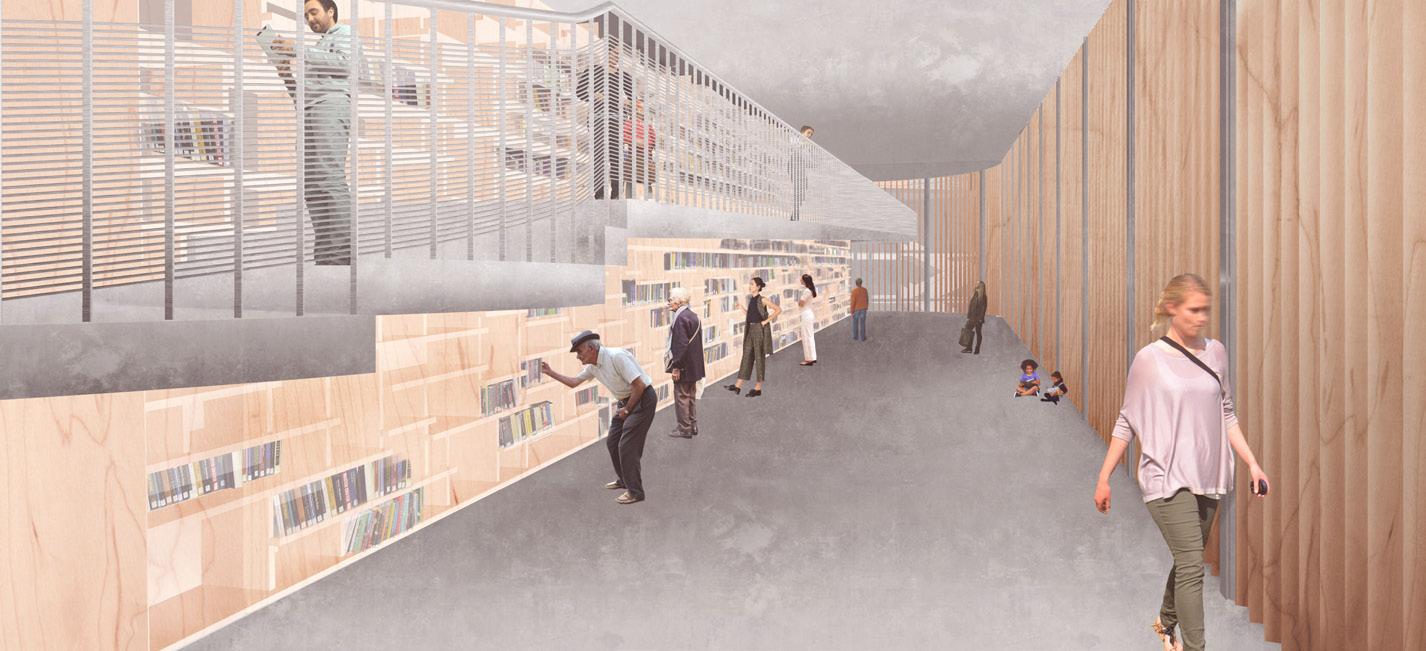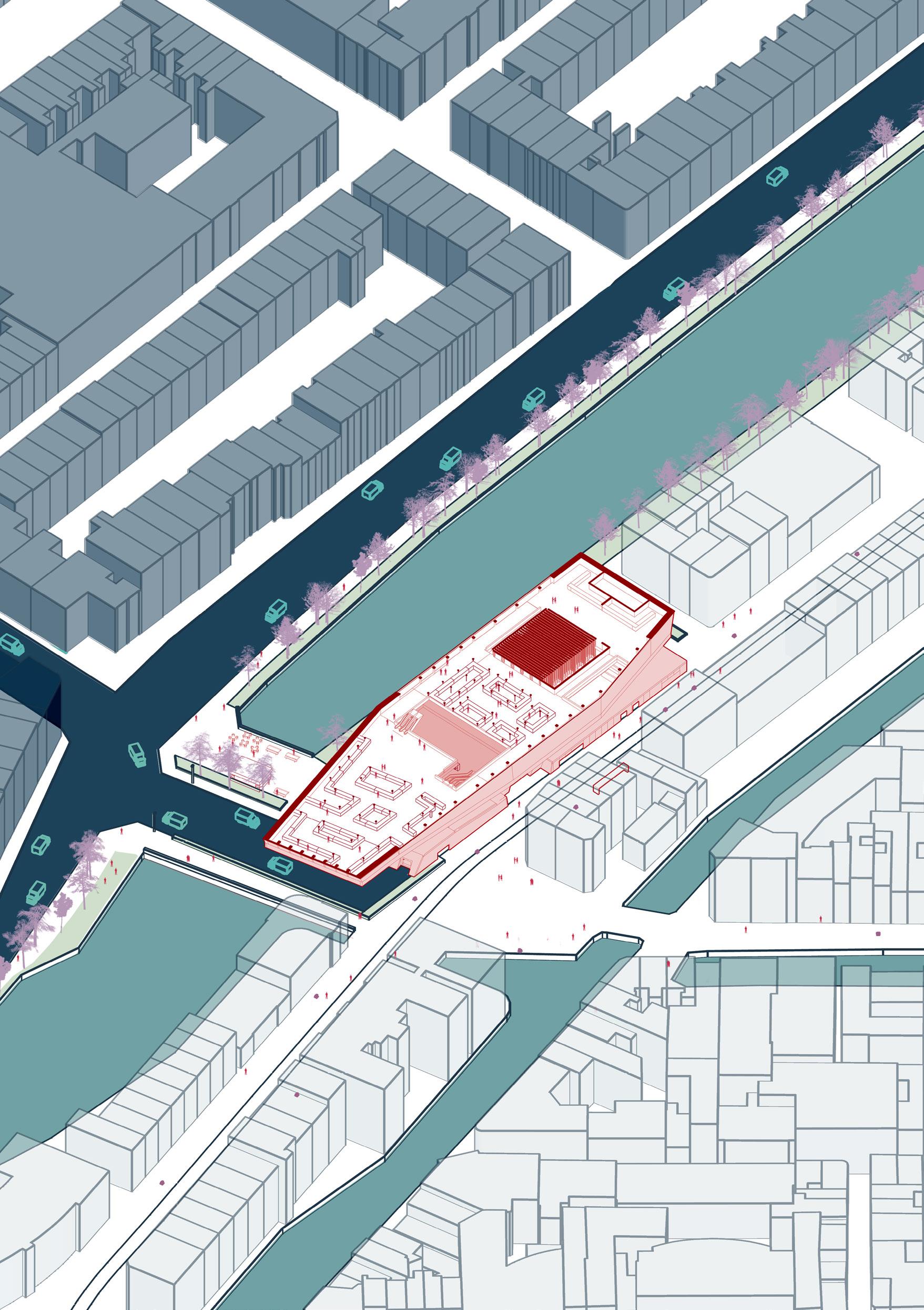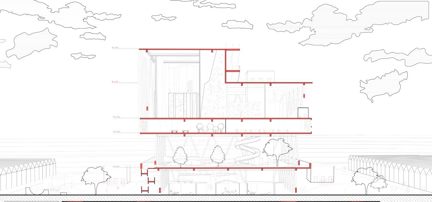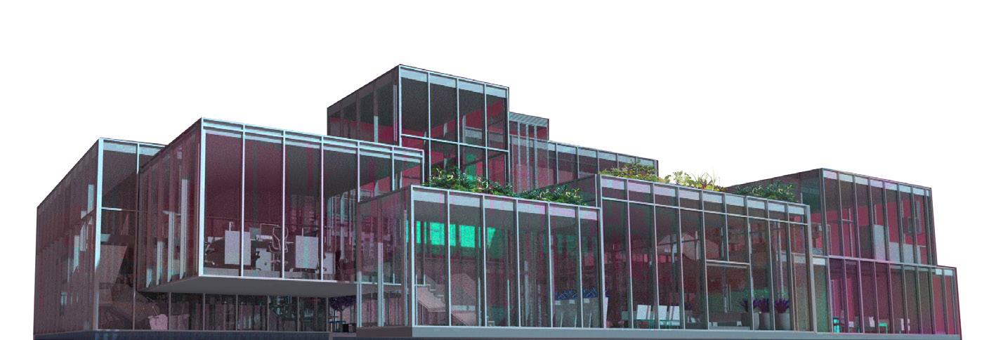 The community centre’s architectural and material language creates a blur between the surroundings and the building itself, with varying roofscape, greenery and glass effects, merging it with the surroundings. Alongside a series of energy-making urban components to be deployed into the fabric of the neighbourhood through a plaza, using architecture as an environmental device.