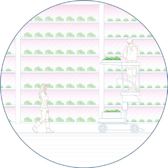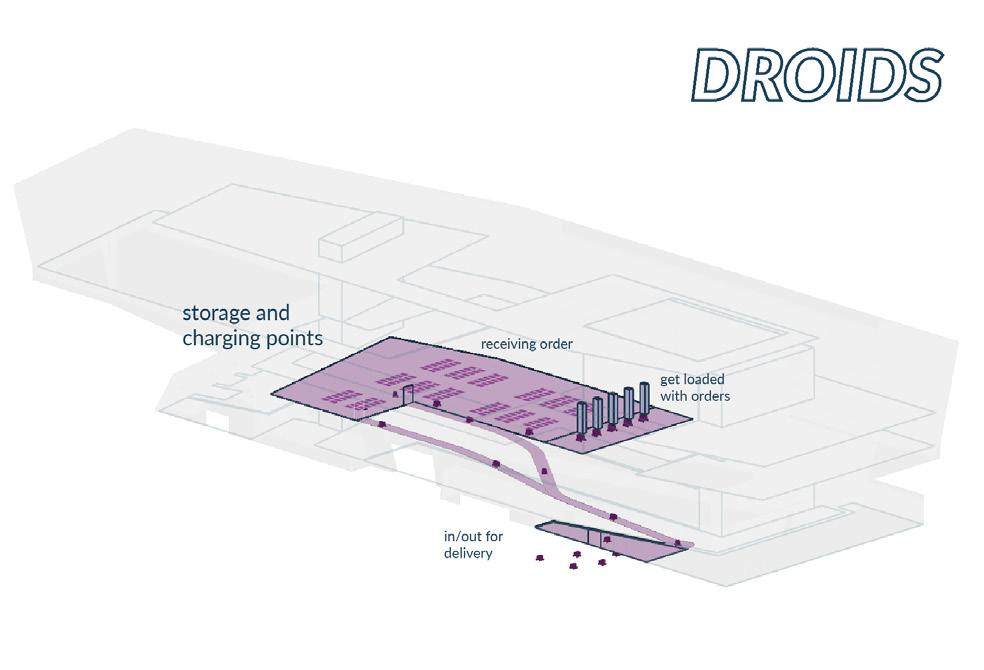 Intentding to increase quality of life in the urban area, Amsterdam city centre will undergo full pedestrianisation, with the only exception of public transport routes. No-cars zones are set up to stop vehicles from getting into the neighbourhoods. Under the framework of park-and-ride systems, transit stations will become a critical infrastructure which ensures efficient and convenient transportation, especially for food deliveries, such as groceries. The process of centralising and (re-)distributing goods will happen here. It is facilitated by an automatized distribution system using autonomous delivery droids which relieve the ‘last mile burden’ of the grocery supply chain.