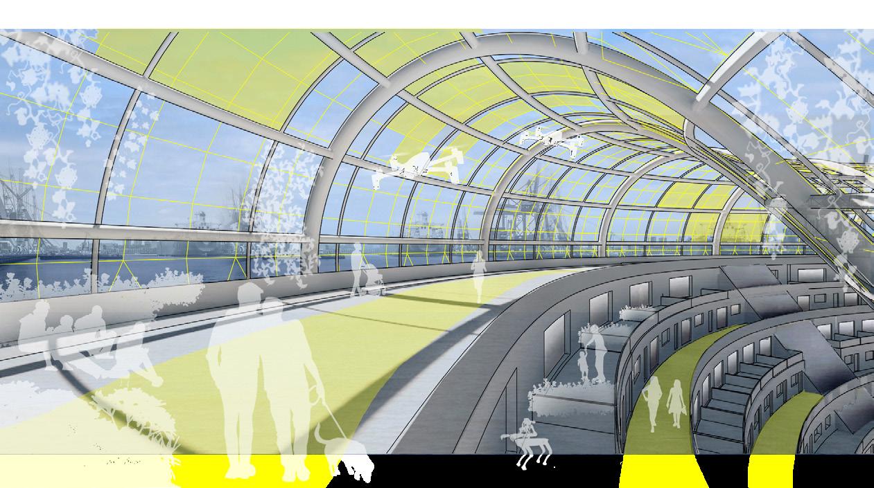 The concept consists in recreating the link between the Port and the City and transforming an infrastructure into an unique environment for a new building typology. By creating new means of transportation, the journey using such radical technologies as a smart boat or fast city cable car, becomes an experience in itself in an almost surreal world full of buildings and objects that are not suitable for human scale or use.
