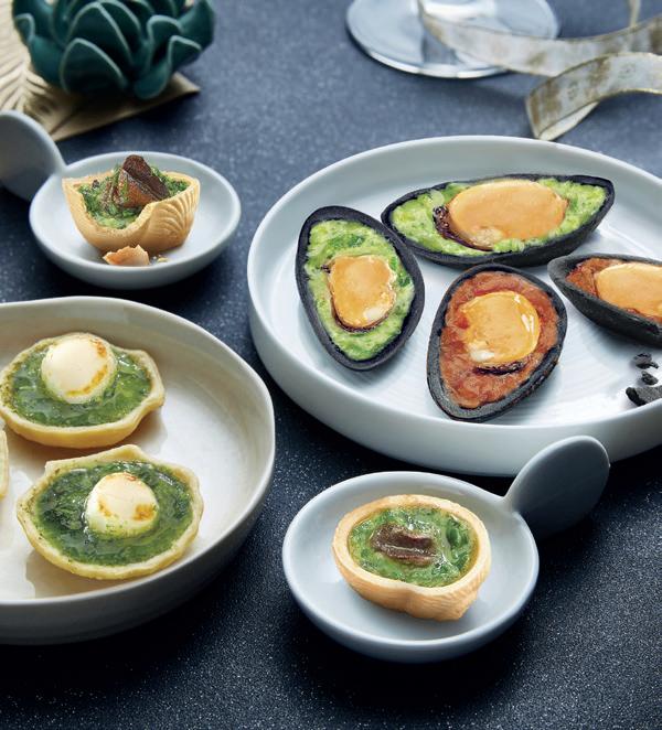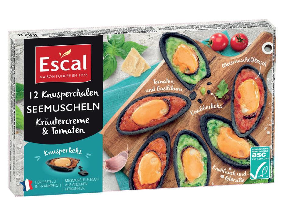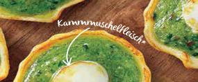 12 Kammmuscheln auf Mürbeteigschalen mit Butter, Knoblauch und Petersilie
