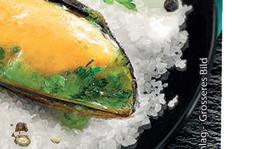 Miesmuscheln auf einer Muschelschale aus Hartkeks