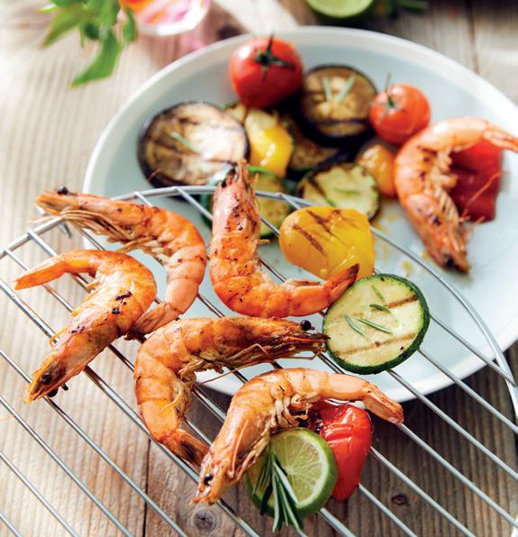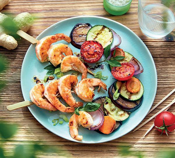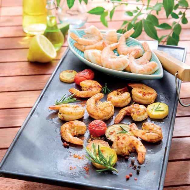 Prawns à la plancha, marinated in chilli and rosemary Prawns skewers and grilled vegetables