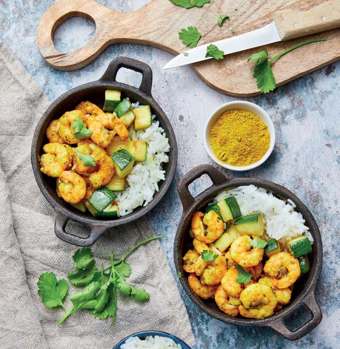 Raw, peeled shrimp tails coated in a curry-coconut sauce