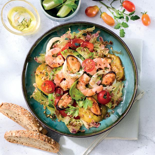 Seafood cocktail with mussels, squid, prawns, cuttlefish, octopus & venus clams