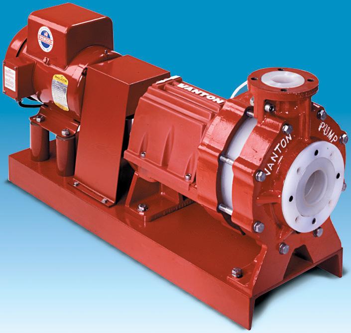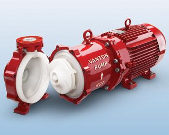 Vanton Chem-Gard CGM-ANSI magnetically driven end suction pumps are seal-less, single-stage process pumps which meet ANSI B73.1 specifications and conform to Hydraulic Institute Standards. All wet-end components are homogenous, injection-molded polypropylene (PP) and polyvinylidene fluoride (PVDF), eliminating metal-to-fluid contact, making them ideally suited for handling corrosive, hazardous and ultrapure fluids. Flows to 450 GPM, heads to 180 ft, and temperatures to 225°F.