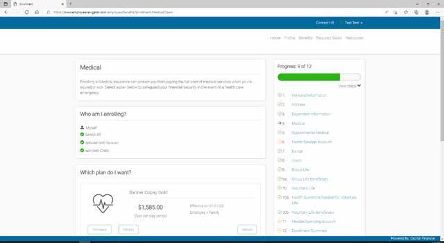 5. Each section will show you the plans that are available to you with the cost to cover you and your dependents. Simply click “Select” for the benefit you want to elect and indicate who will be covered on the plan.