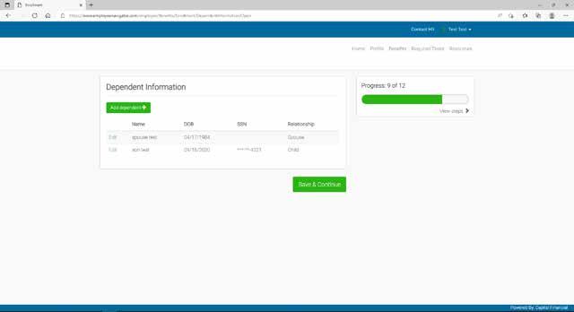 4. Add any dependents that will be covered under your insurance or listed as your district-paid life insurance beneficiary. Then click Save & Continue to move on to make your benefit elections.