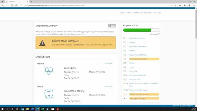 6. After you have made your selections, you will be given a chance to review them again and be advised of the total cost as well as any sections you may have missed. Once reviewed, hit “Click to Sign” to finalize your enrollment. Once confirmed, you will see a confirmation page where you can download a summary of your enrollment to be saved or printed.