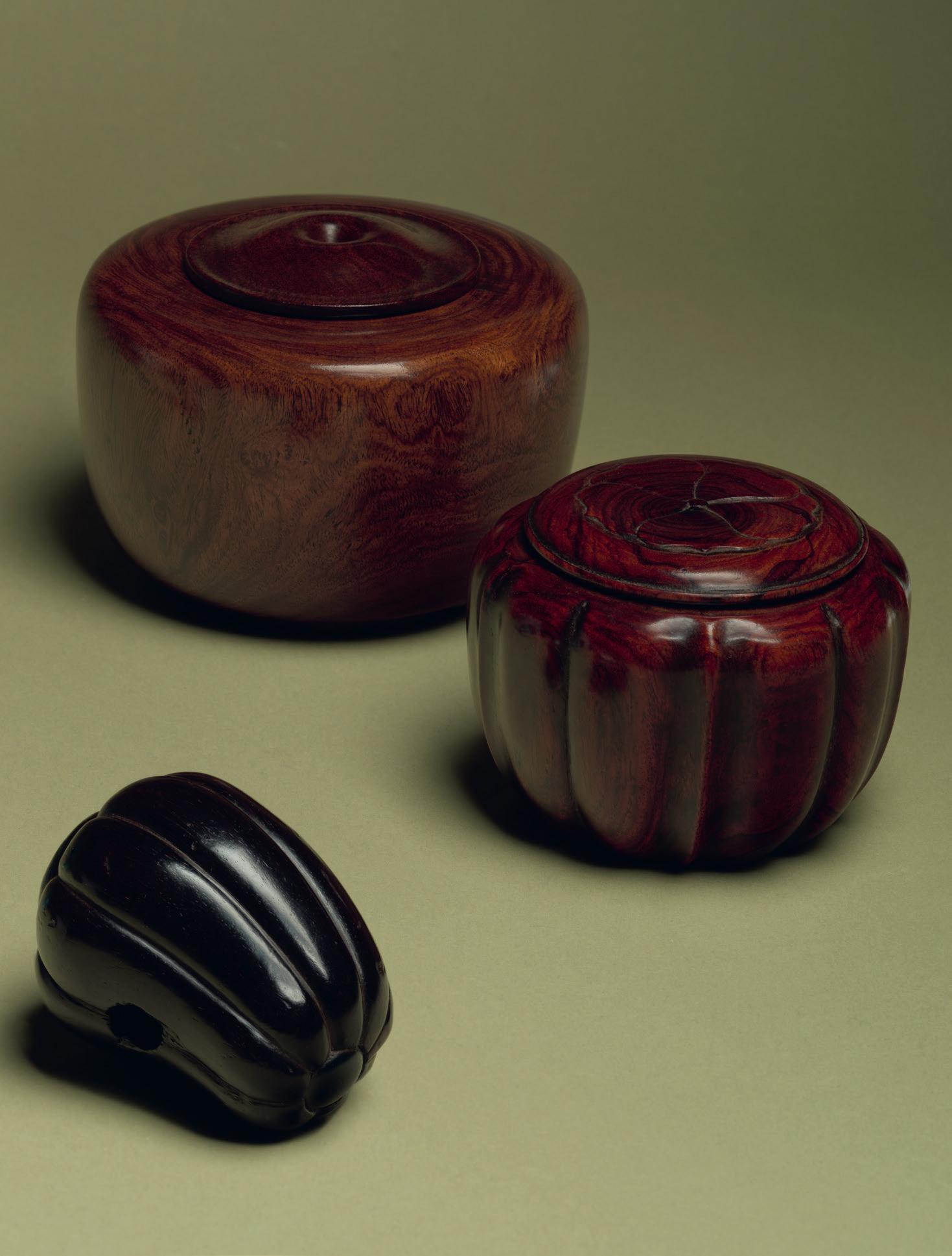 Weiqi counter containers are likewise found in a range of shapes and materials, including stoneware, porcelain, lacquer and different hardwoods. Based on what survives today and from depictions in paintings, the Ming dynasty onwards saw lacquered or wood boxes increasingly favoured, perhaps as hardwoods began to be imported into China. Perhaps also, as the game became a shorthand to represent the scholar and the literati way of life, the use of materials considered suitable for a scholar’s study, such as fine hardwood, was increasingly popular. Hardwood weiqi containers such as the three examples in the present exhibition are still relatively rare, with versions found for instance in huanghuali, zitan and hongmu