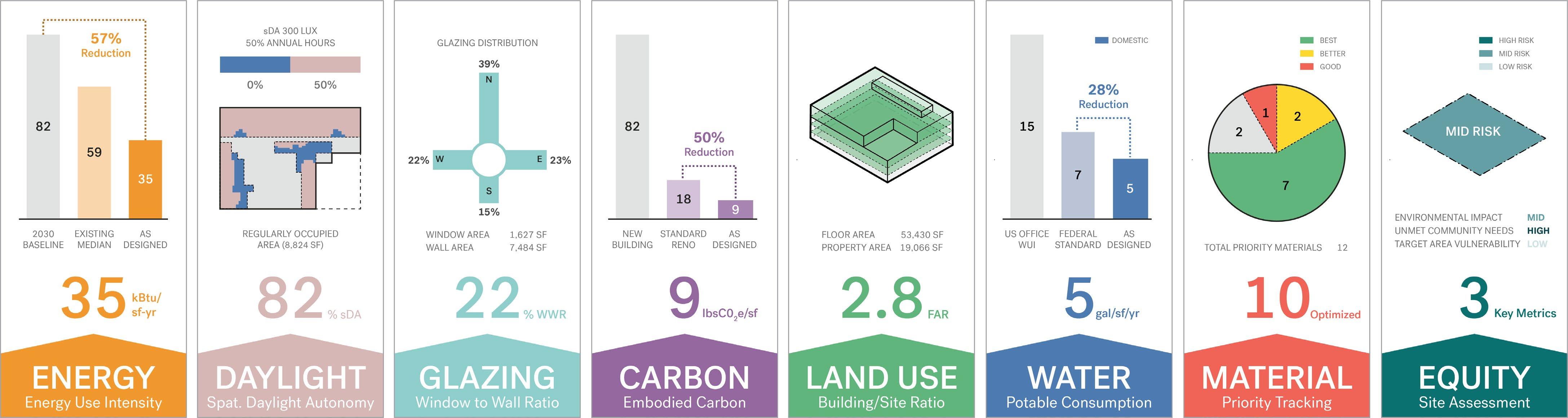 The design of our new studio reflects our commitment to measurable performance and environmental stewardship. The metrics shown here—our project’s own “Nutrition Label”—illustrate how design decisions translate into tangible results. Through targeted interventions, the studio achieved a 57% reduction in energy use intensity, far exceeding the 2030 baseline. Daylight autonomy of 82% ensures that nearly all regularly occupied spaces benefit from natural light throughout the workday, while a 22% window-to-wall ratio strikes a balance between daylight access and thermal performance.