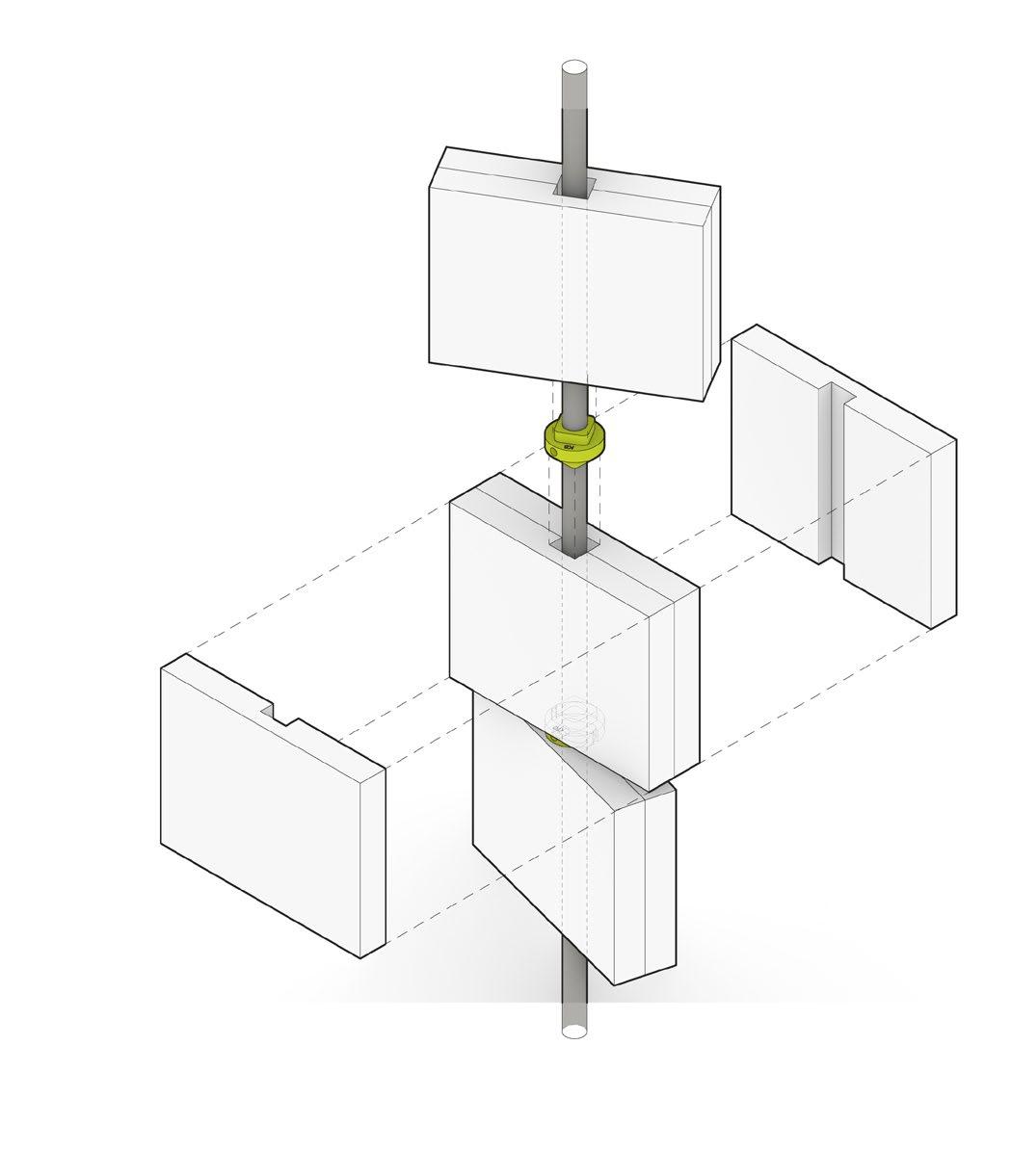 The Screen Wall’s design is built from 26 vertical steel rods anchored at the floor and ceiling, each supporting 20 reclaimed wooden blocks. The rotation of each block is controlled by a custom 3D-printed joint, whose alignment collectively produces the wall’s subtle wave effect. At eye level, openings reveal framed views through the EDR “plus” logo and toward the studio’s entry.