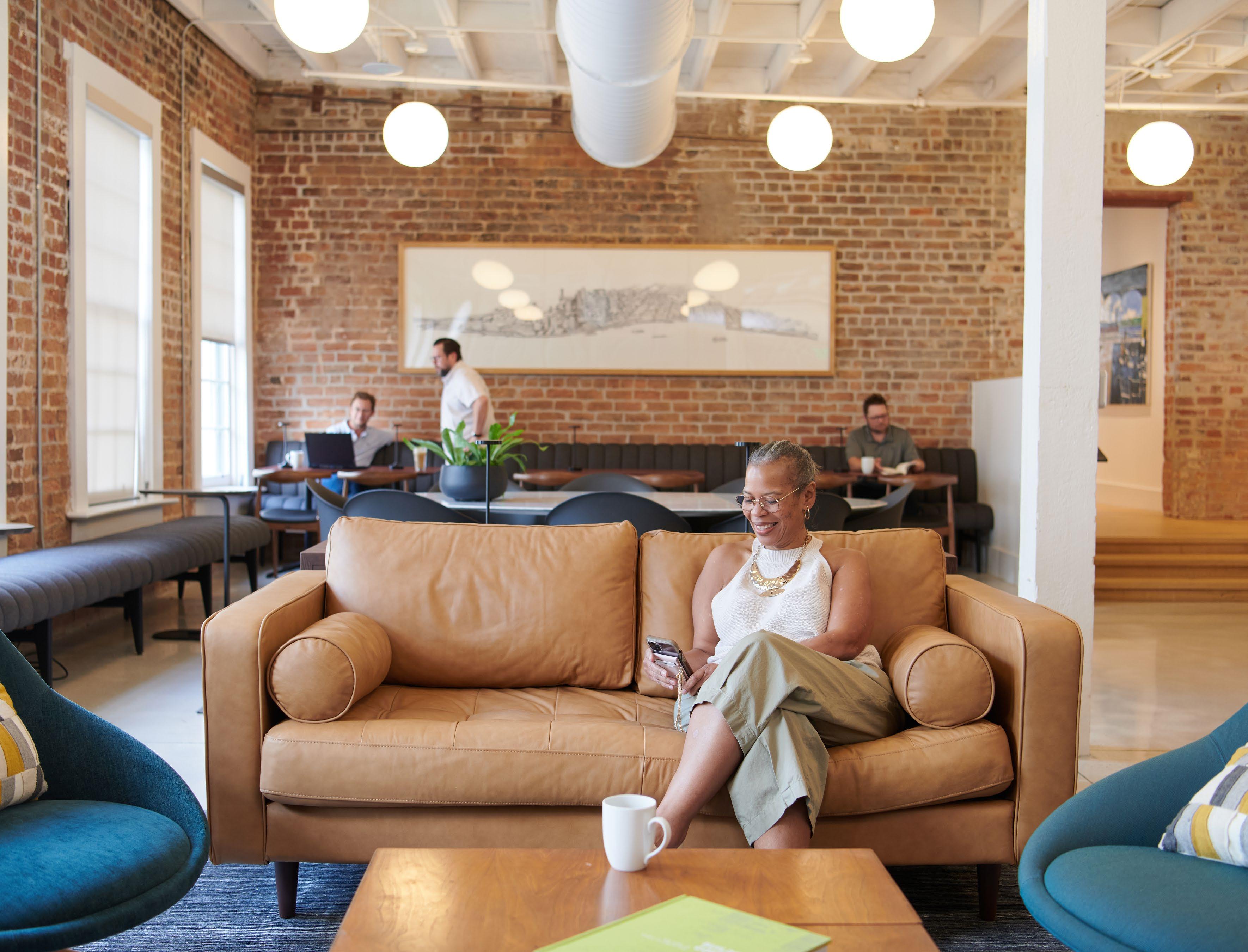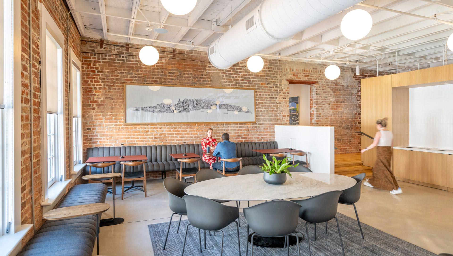 Blending hospitality and workplace design, the space balances warmth and utility.