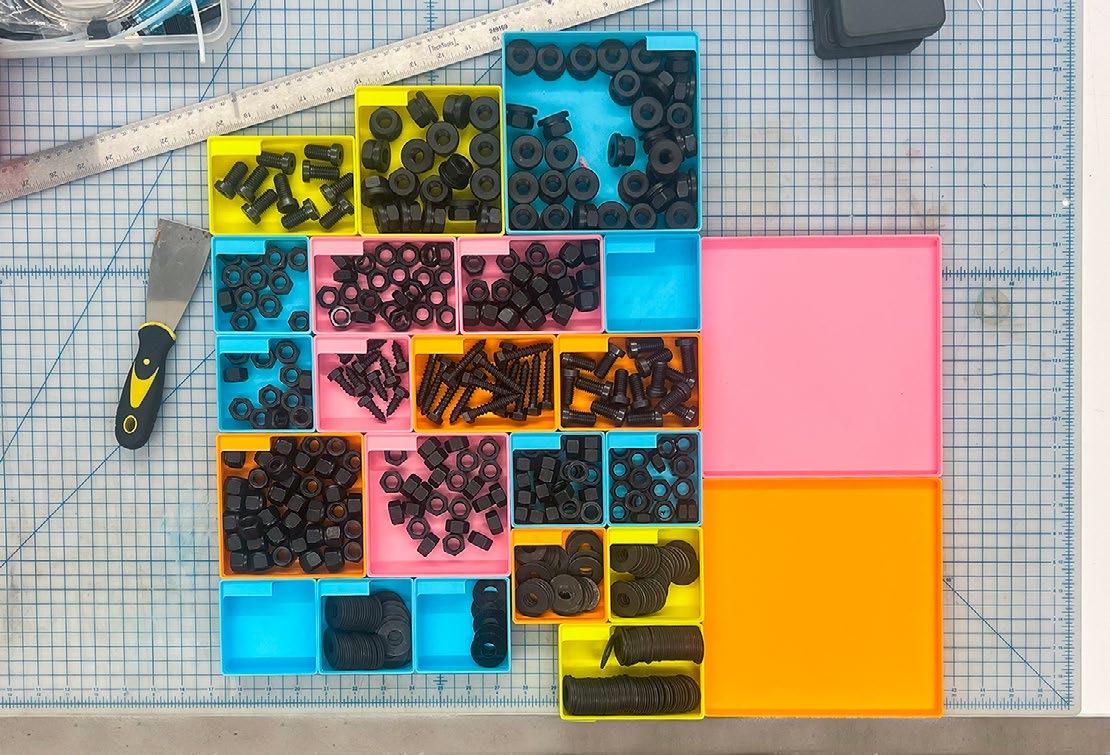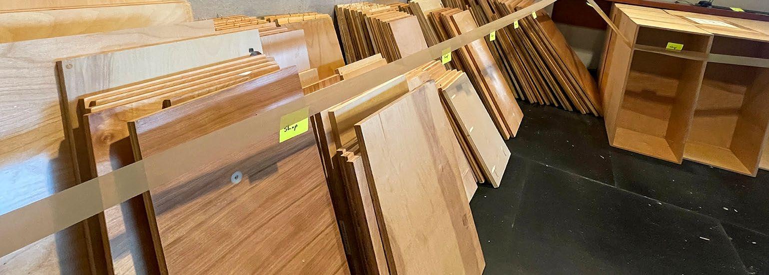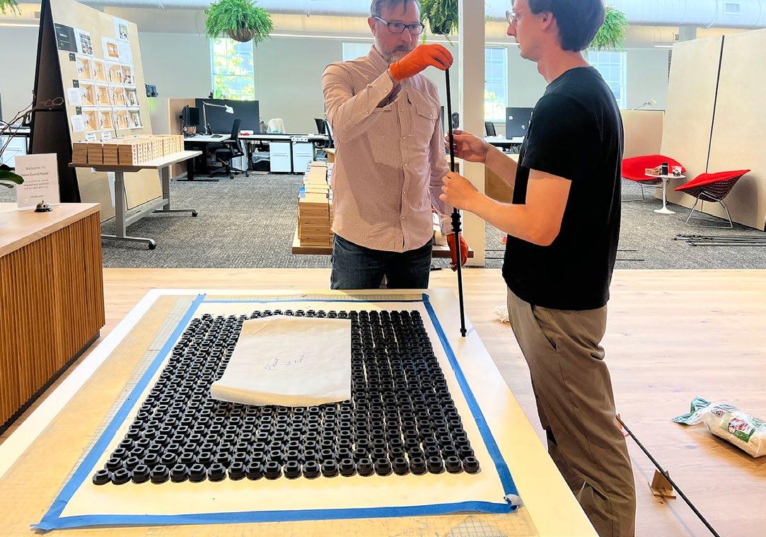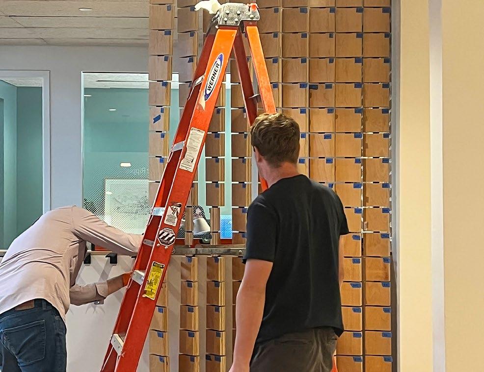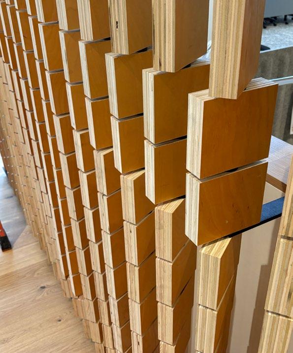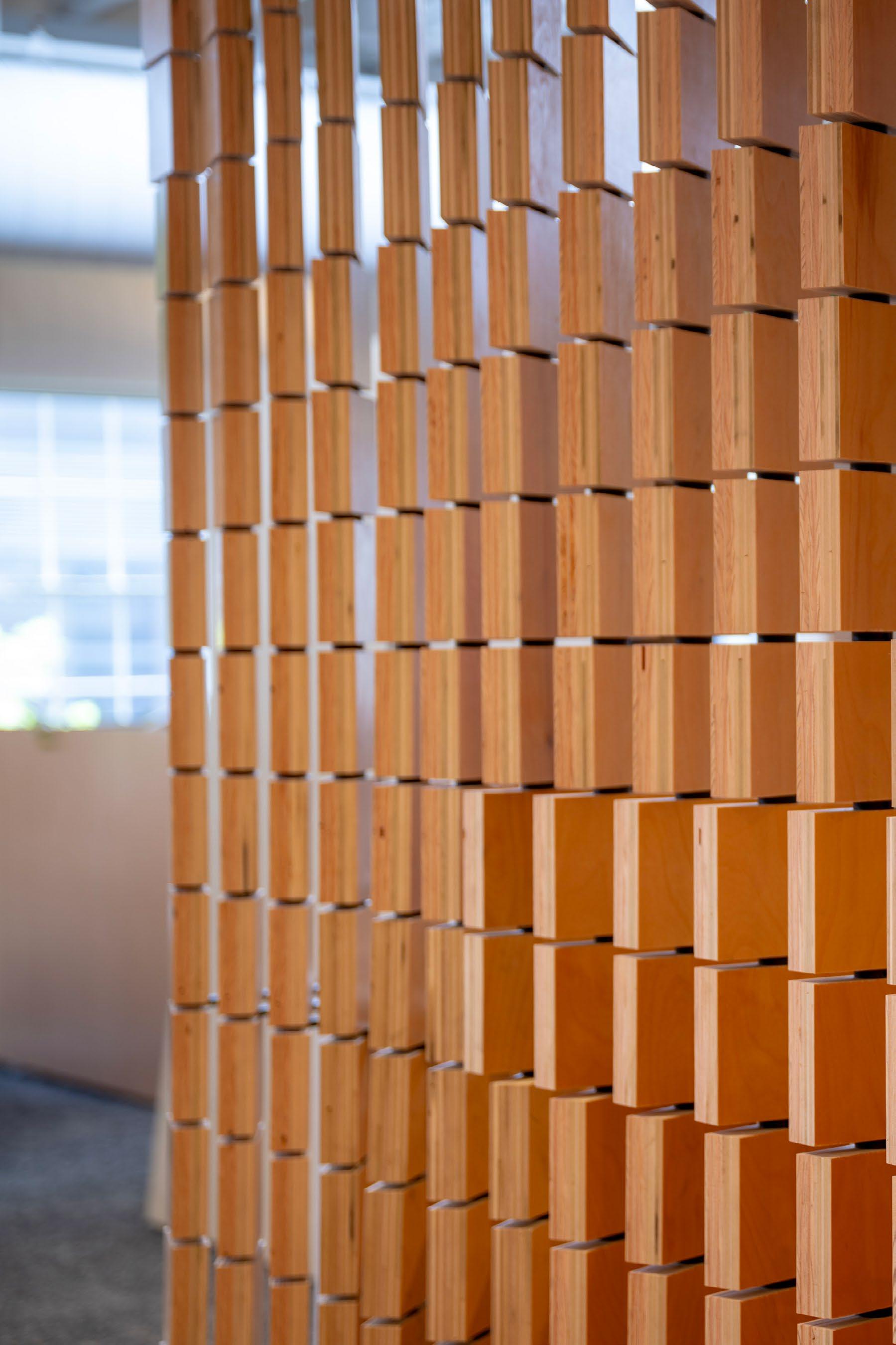 Fabricated entirely in-house, the installation became a fullstudio effort—designers repurposed plywood desktops from the former office, cut, milled, and refinished into more than 1,100 modular pieces. The result is a system that merges digital precision with handcraft, exemplifying the collaboration and care that define our practice.