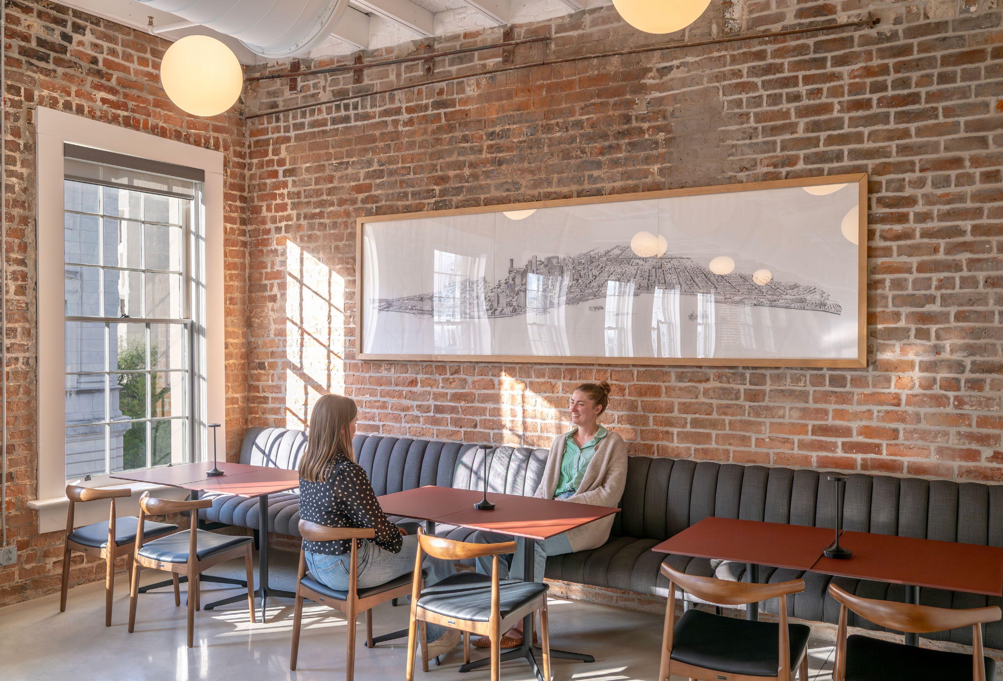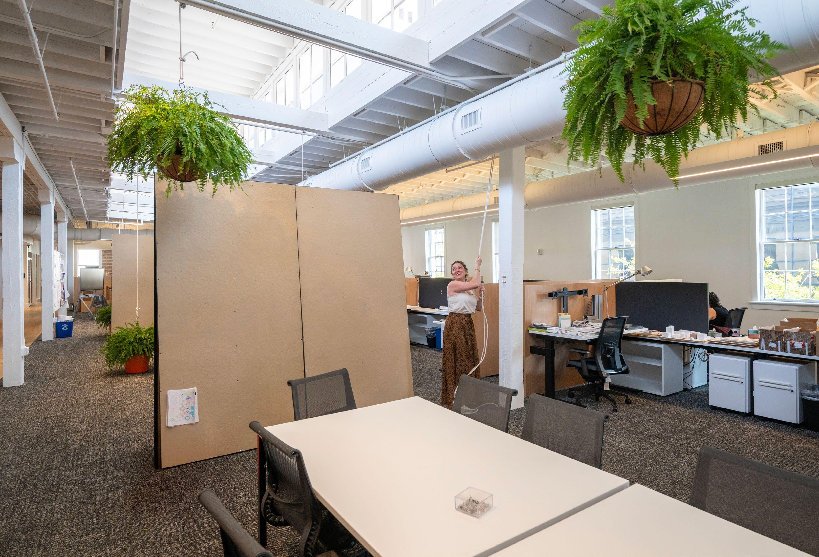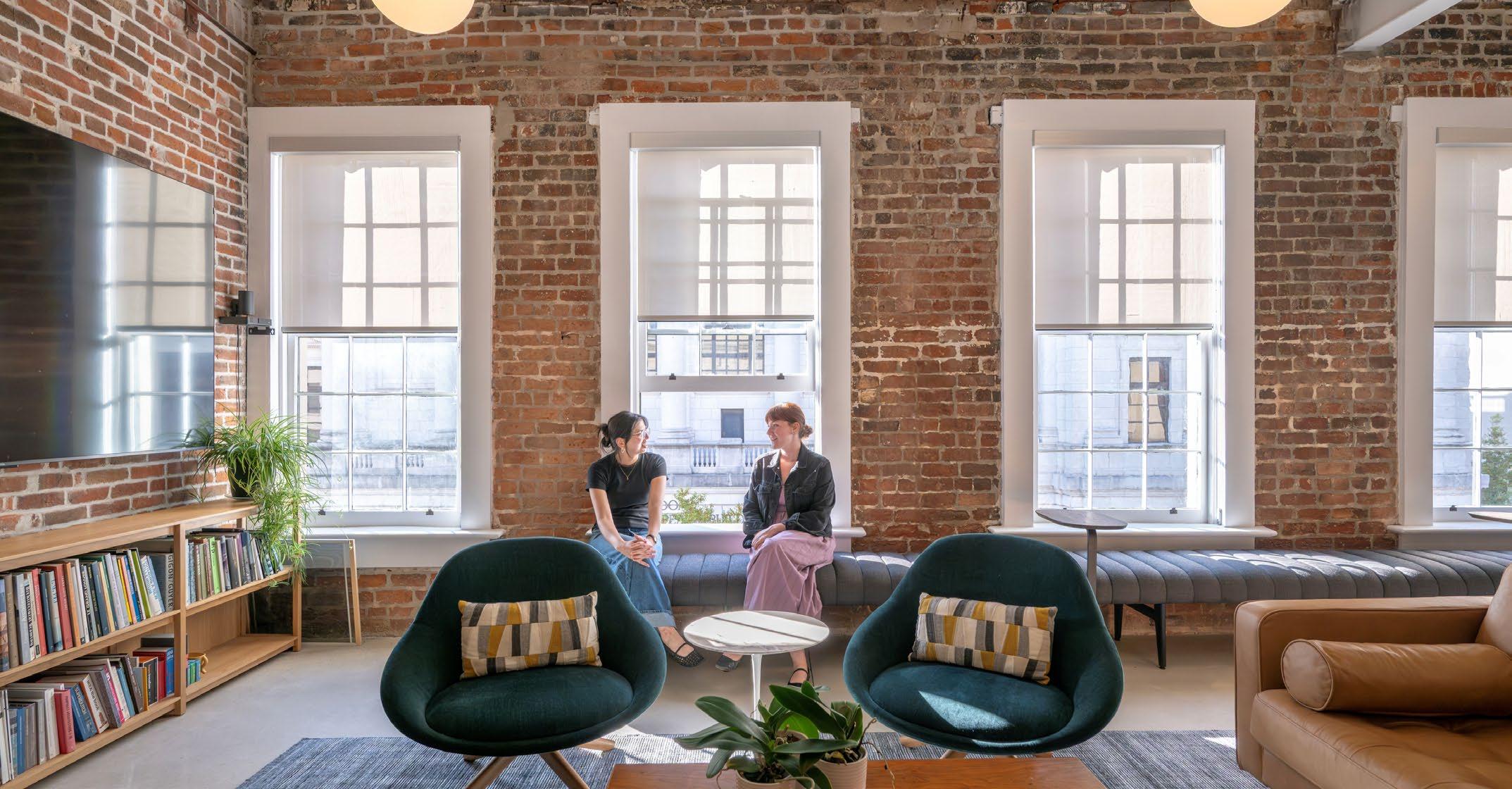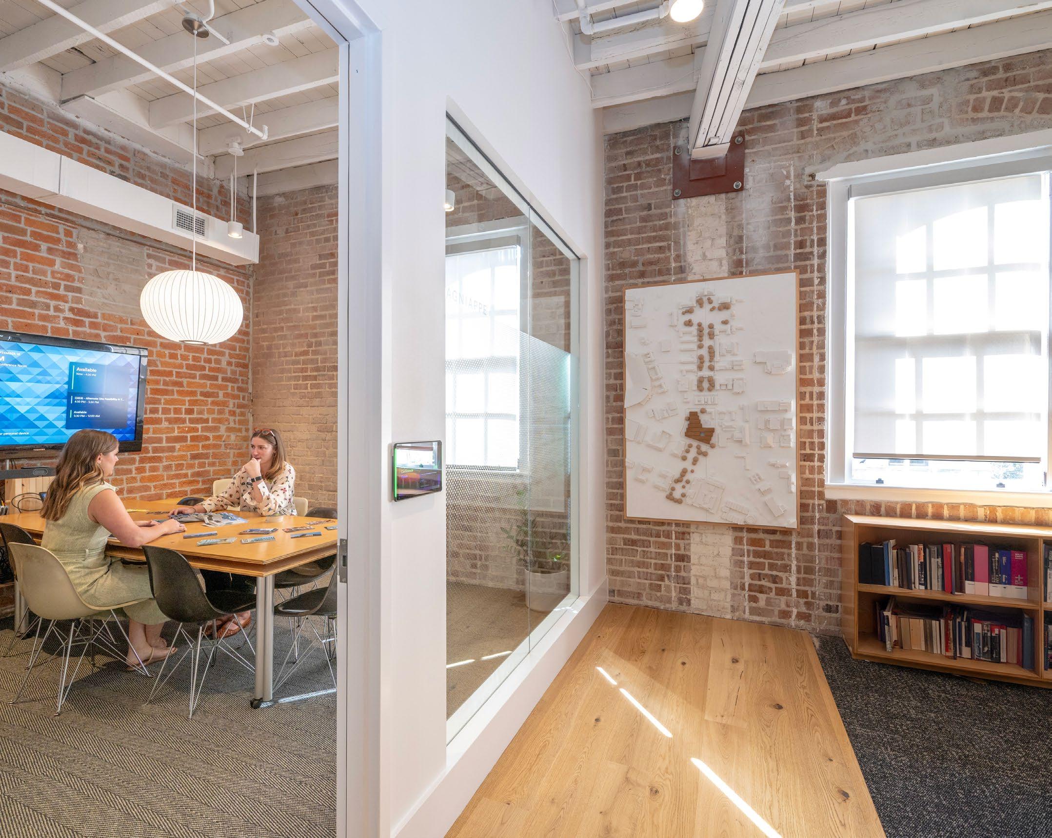 Our experience designing modern workplaces has deepened our understanding of the delicate balance between focus and collaboration. Today’s employees seek flexibility, connection, comfort, and variety—qualities that support both personal well-being and collective productivity. Access to natural light plays a vital role, enhancing alertness, mood, and overall wellness throughout the workday. Within our studio, a mix of collaborationfocused areas—such as meeting tables and pin-up walls—exists alongside quieter zones for individual concentration. This variety gives team members agency over how and where they work.