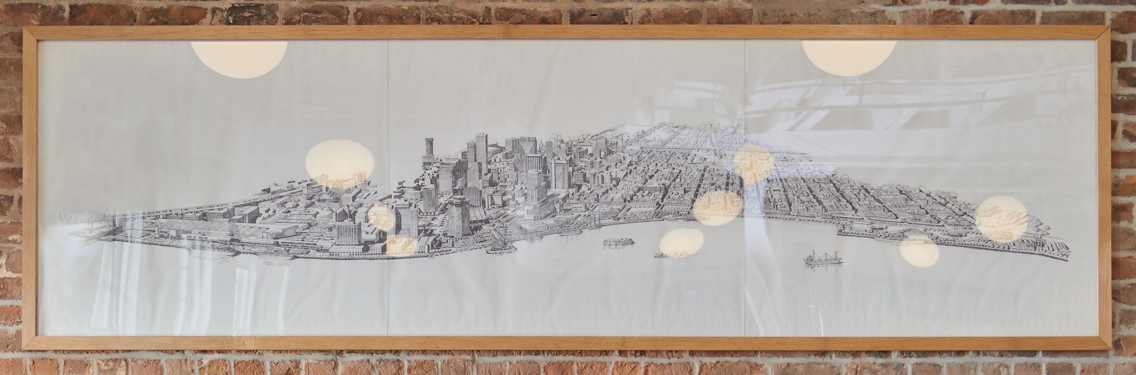The large piece of art hanging in the Neutral Ground space is a framed, hand-drawn depiction of the city of New Orleans, discovered by the design team while cleaning out our former Canal Street office in preparation for the move. Drawn by H. Schultz, the team recognized it as a reflection of the creativity and craftsmanship that have long defined the firm’s history—and knew it deserved a prominent place in the new studio.