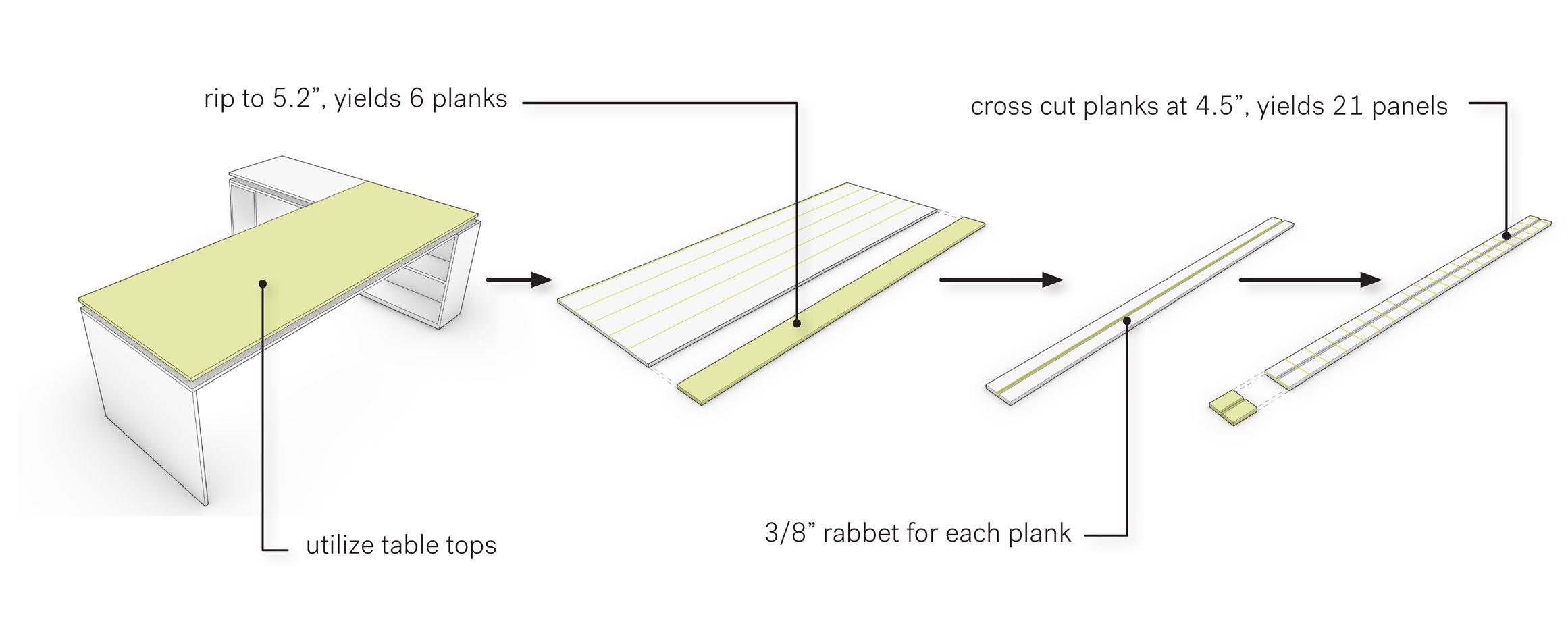 Process diagram showing how reclaimed desks were transformed into panels for the Screen Wall.
