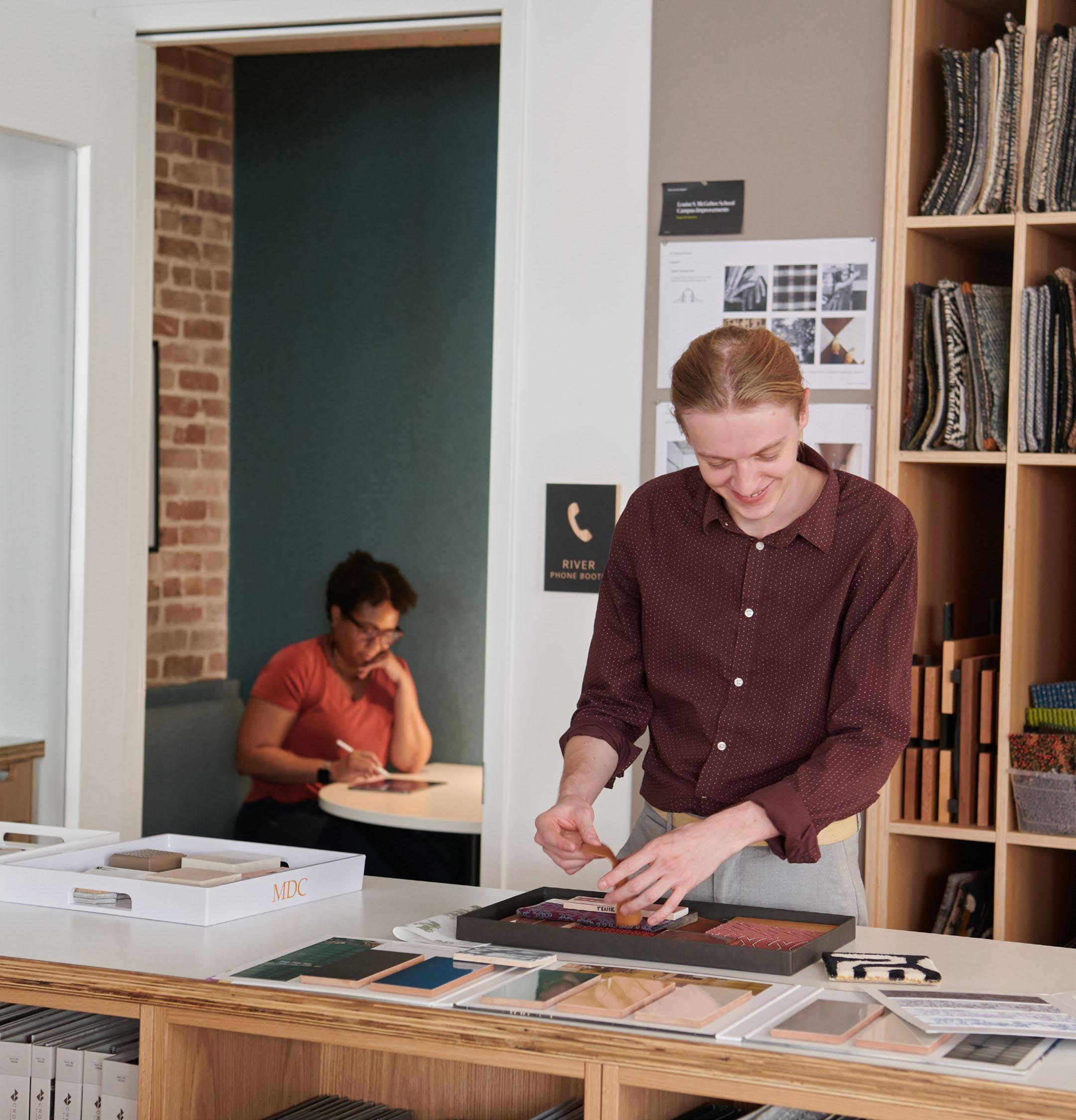 Integral to the success of our projects are the materials we design with. Our Materials Lab is woven directly into the studio environment—enhancing visibility, accessibility, and emphasizing the importance of healthy material choices. Every material is vetted using our Healthy Materials Toolkit, developed by a previous Research Fellowship. The system’s organization allows designers to easily store, update, and locate samples among nearly 20,000 options spanning both architecture and interiors, ensuring that thoughtful, responsible selections remain at the core of every project.