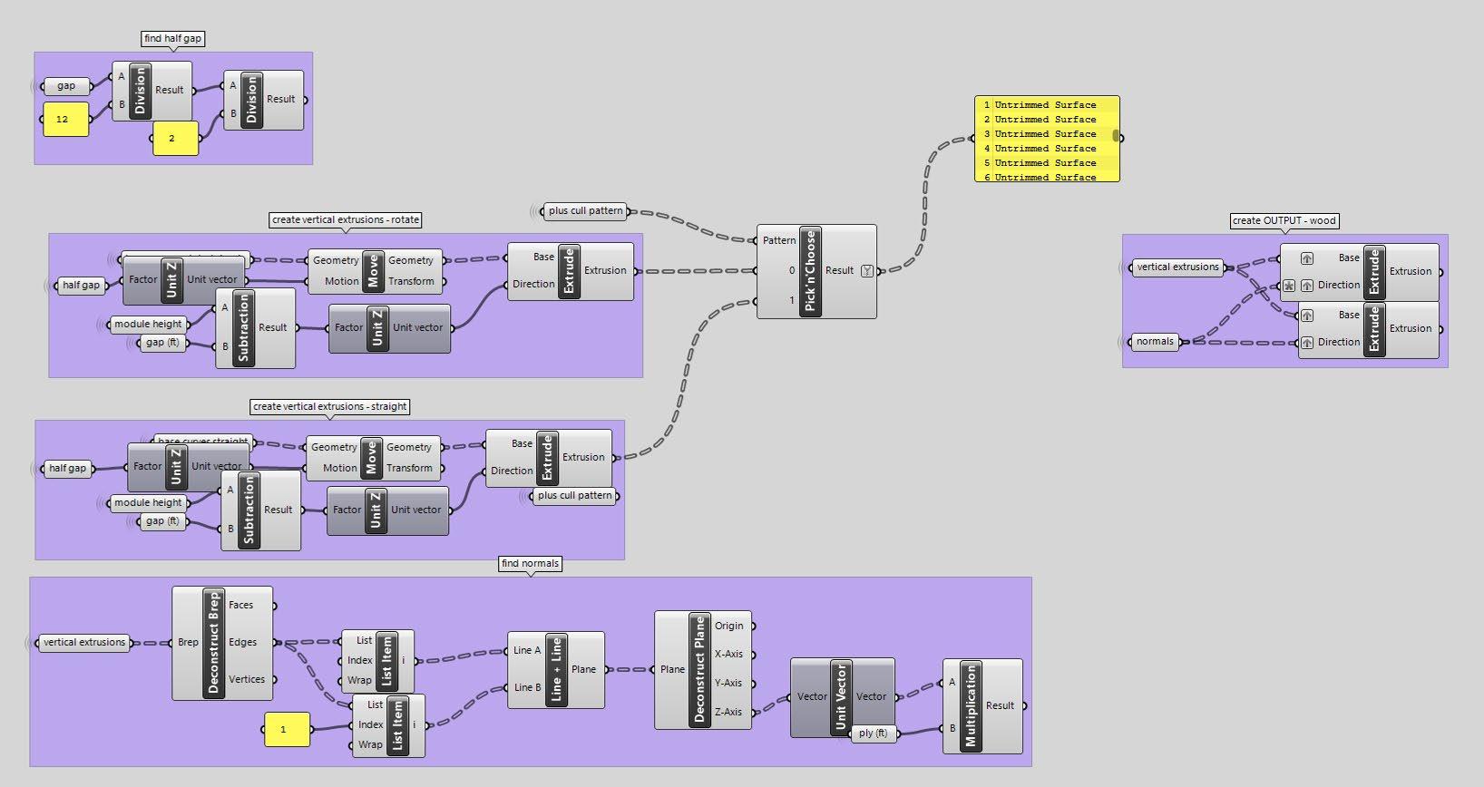 Excerpt from the Grasshopper definition that drives the wall’s logic—defining spacing, alignment, and connector geometry for fabrication.