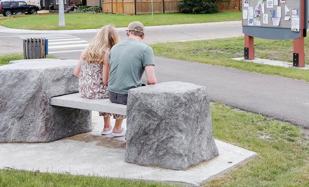 Stony Plain’s first public art bench is a combination of poured solid concrete and hand carved concrete rocks. The heaviness of the work conveys a sense of grounding while users are enjoying the outdoors.
