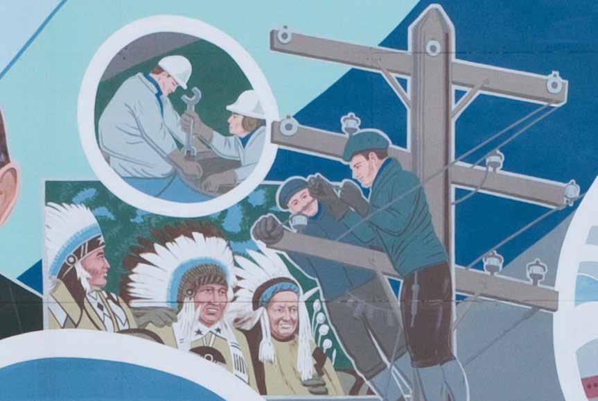 This mural reflects a century of electric power supply in Alberta and its impact on the local community, with an emphasis on TransAlta’s contributions and local representation. Individuals of significance to TransAlta are featured, along with local residents, such as John L. McDonald’s daughter, Annie Christina and John Armbruster, who first provided Stony Plain with electricity in the early 1920s.