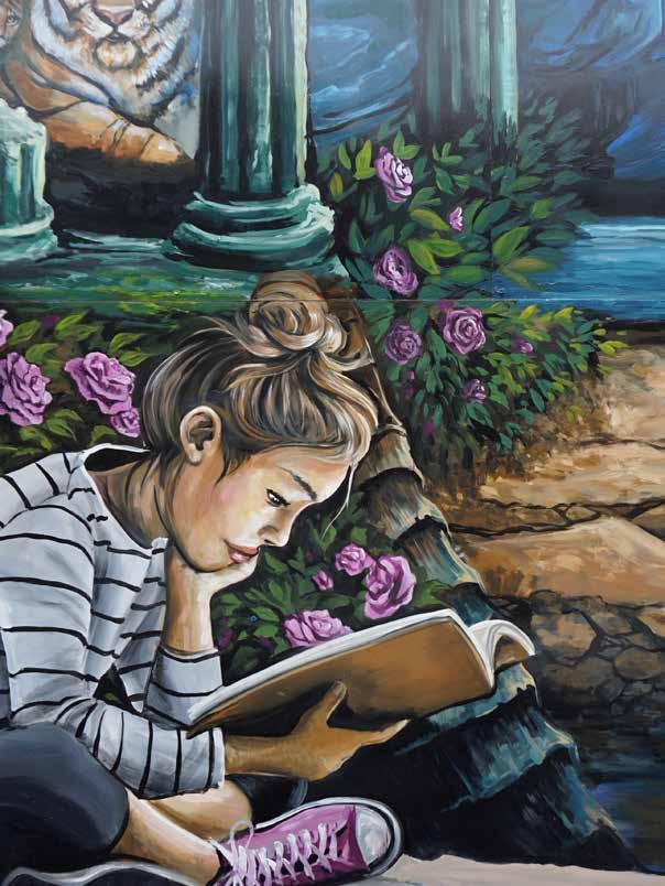 A whimsical world awaits you when you enter the depths of your imagination. This mural represents people sitting on the ledge and children going deeper into the mural of fantasy with hidden images of characters and creatures. The wall is broken away around the edges so the viewer feels like they could hop into the mural.