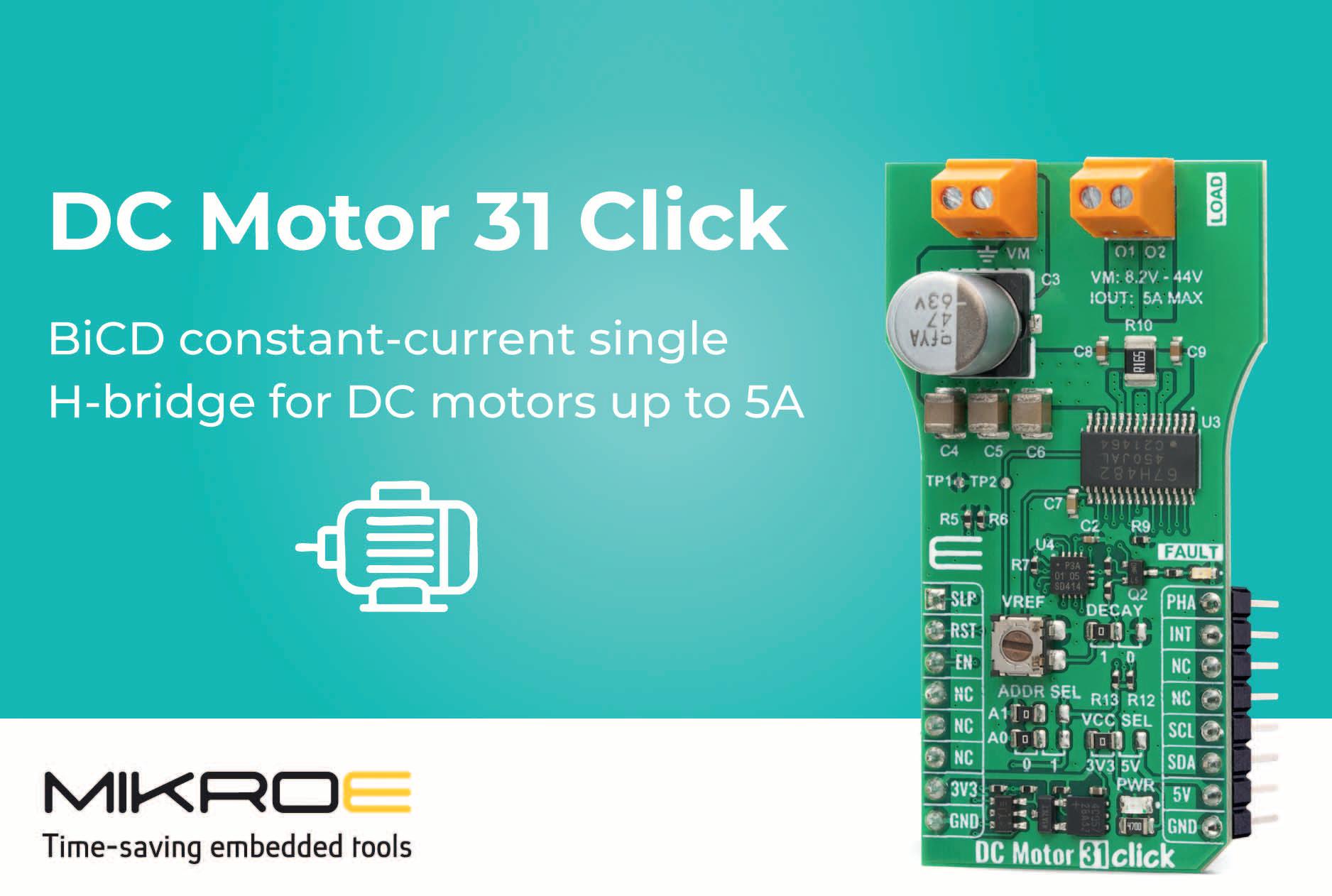 DC Motor 31 Click este o placă add-on compactă, destinată acționării motoarelor DC cu perii, care asigură control precis, reglarea cuplului și monitorizarea defecțiunilor într-o gamă largă de aplicații industriale și robotice. Produsă de MIKROE, companie specializată în soluții embedded ce accelerează semnificativ dezvoltarea prin hardware și software inovator bazat pe standarde consacrate, această placă extinde impresionanta familie de plăci Click™ care numără deja peste 1800 de module.