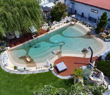 client. La construction repose sur une membrane d’étanchéité protégée par deux couches de résine appliquées à la main, sans éléments préfabriqués. Le choix des teintes, l’intégration de pierres naturelles, de banquettes immergées, d’éclairages ou encore de systèmes de nage à contre-courant permettent une personnalisation complète. Des éléments décoratifs, tels que des cascades en pierres naturelles ou des jeux d’eau intégrés sous forme de fontaines minérales, viennent enrichir l’installation et renforcer son caractère paysager. Si l’esthétique évoque un étang, le traitement de l’eau reste celui d’une piscine classique, garantissant confort et sécurité.
