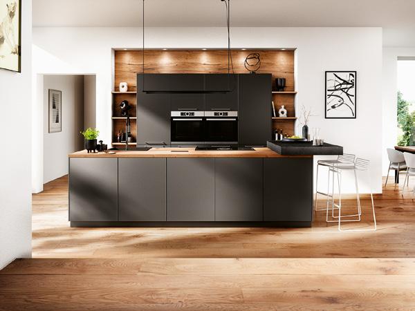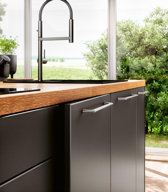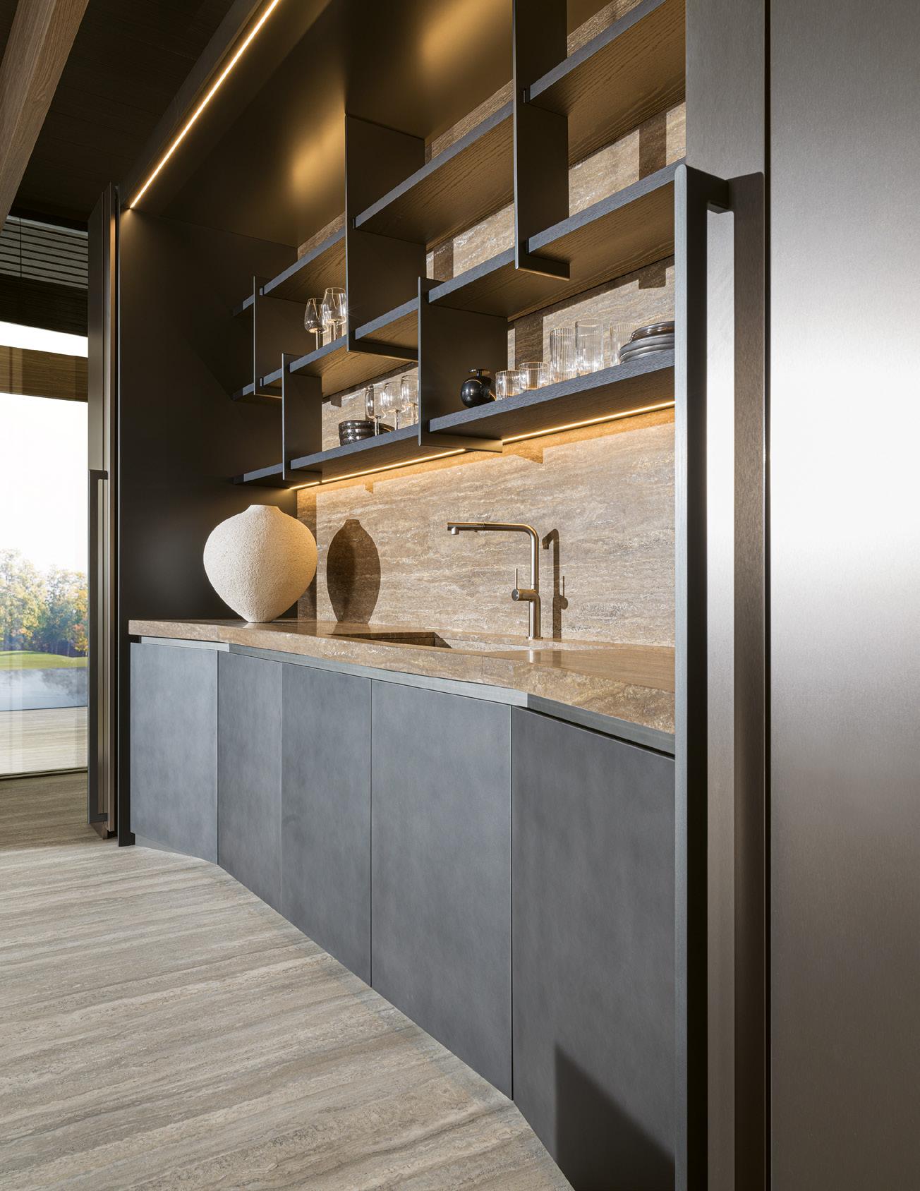 Une cuisine qui joue sur les vides et les pleins soulignés par la géométrie des chants, ainsi que sur les effets de matière entre laque mate rehaussée d’un léger scintillement métallique et finition bois. Collection Vida. fust.ch